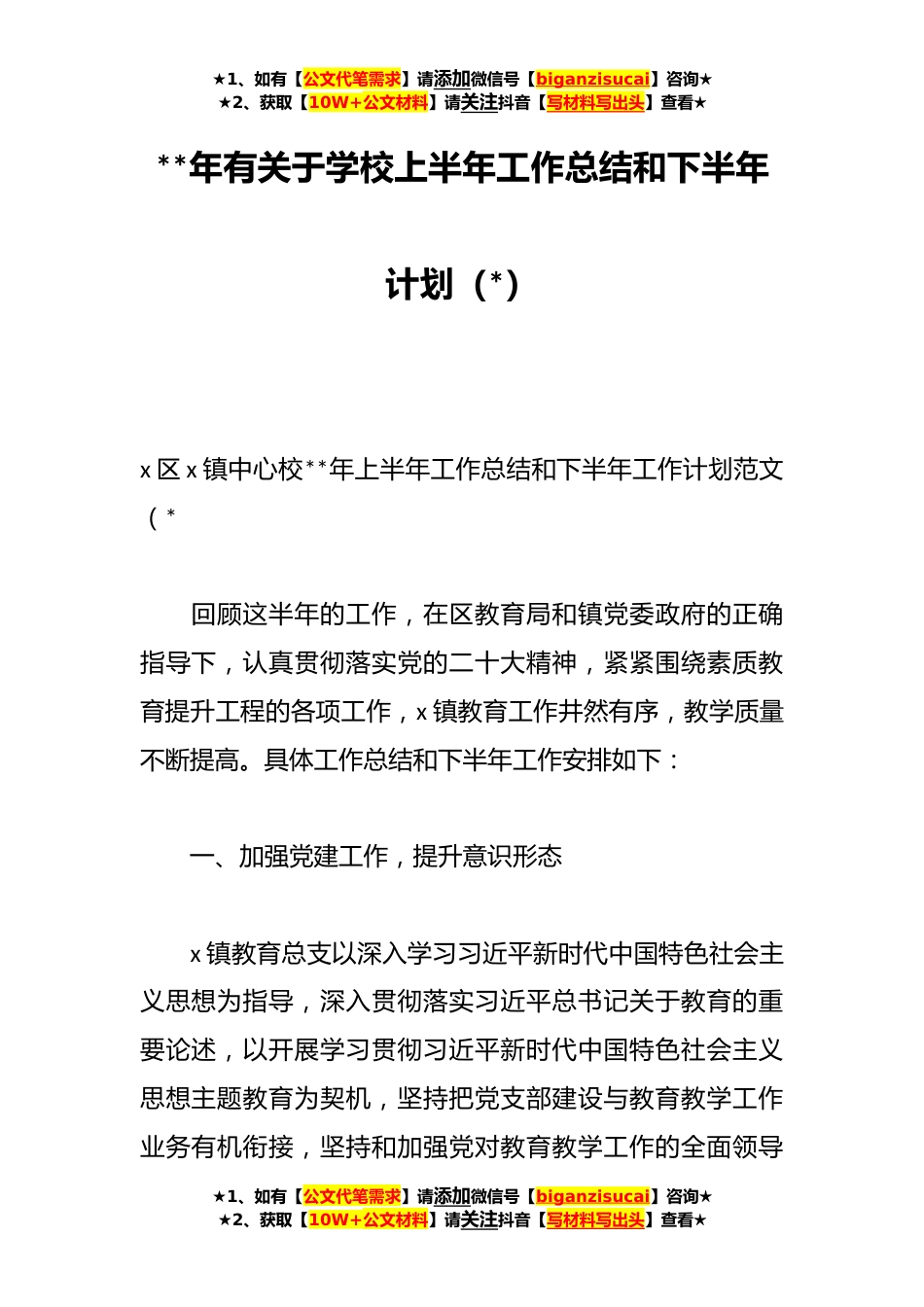 ★1、如有【公文代笔需求】请添加微信号【biganzisucai】咨询★★2、获取【10W+公文材料】请关注抖音【写材料写出头】查看★**年有关于学校上半年工作总结和下半年计划(*)x区x镇中心校**年上半年工作总结和下半年工作计划范文(*回顾这半年的工作,在区教育局和镇党委政府的正确指导下,认真贯彻落实党的二十大精神,紧紧围绕素质教育提升工程的各项工作,x镇教育工作井然有序,教学质量不断提高。具体工作总结和下半年工作安排如下:一、加强党建工作,提升意识形态x镇教育总支以深入学习习近平新时代中国特色社会主义思想为指导,深入贯彻落实习近平总书记关于教育的重要论述,以开展学习贯彻习近平新时代中国特色社会主义思想主题教育为契机,坚持把党支部建设与教育教学工作业务有机衔接,坚持和加强党对教...