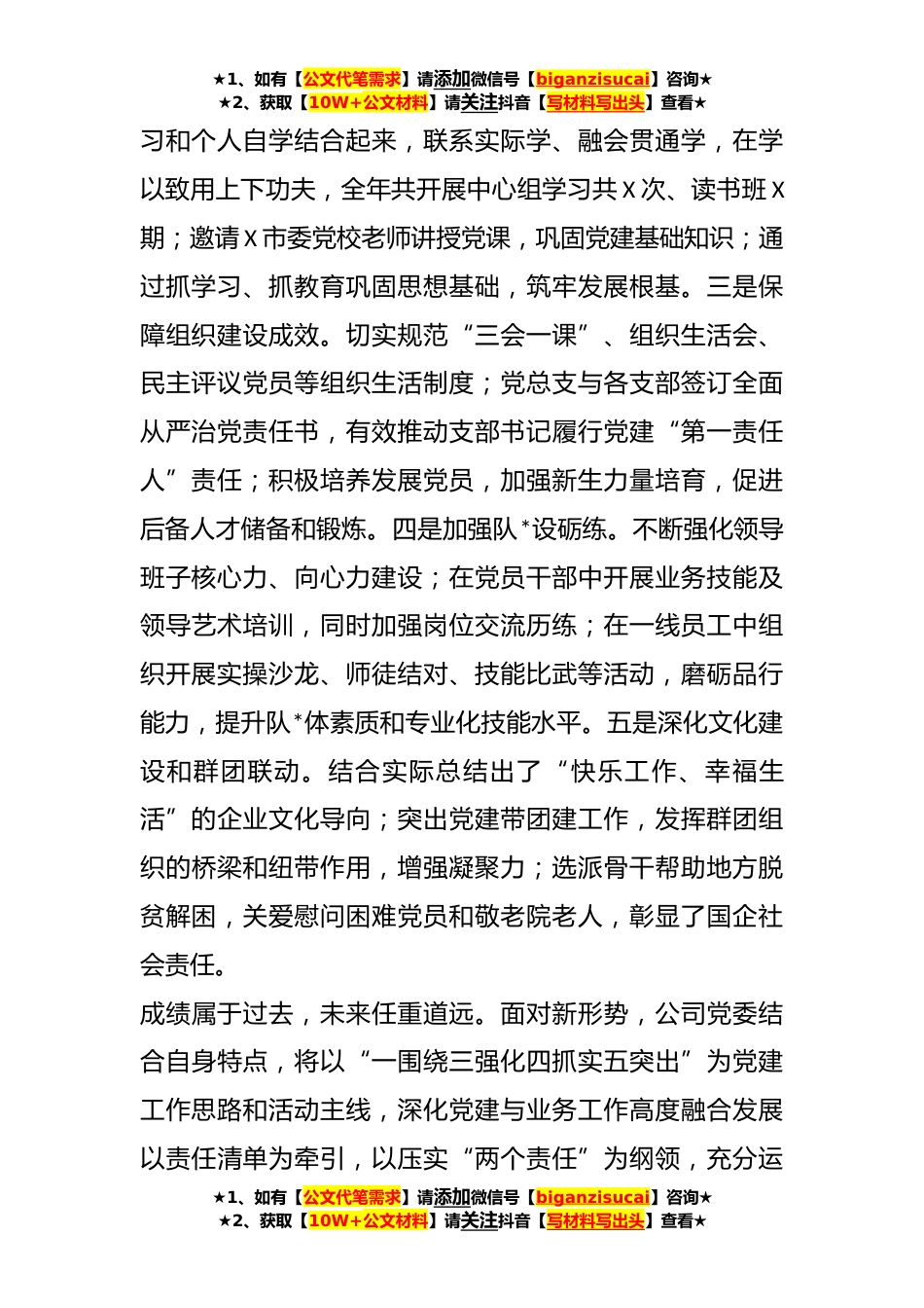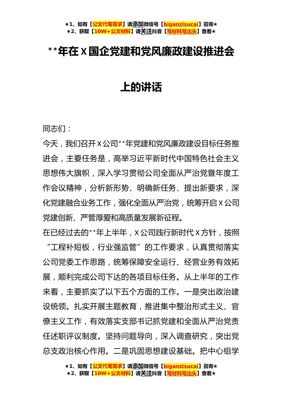★1、如有【公文代笔需求】请添加微信号【biganzisucai】咨询★★2、获取【10W+公文材料】请关注抖音【写材料写出头】查看★**年在X国企党建和党风廉政建设推进会上的讲话同志们:今天,我们召开X公司**年党建和党风廉政建设目标任务推进会,主要任务是,高举习近平新时代中国特色社会主义思想伟大旗帜,深入学习贯彻公司全面从严治党暨年度工作会议精神,分析新形势、明确新任务、提出新要求,深化党建融合业务工作,强化全面从严治党,统筹开启X公司党建创新、严管厚爱和高质量发展新征程。在已经过去的**年上半年,X公司践行新时代X方针,按照“工程补短板,行业强监管”的工作要求,认真贯彻落实公司党委工作思路,统筹保障安全运行、经营业务有效拓展,顺利完成公司下达的各项目标任务。从上半年的工作来看,...