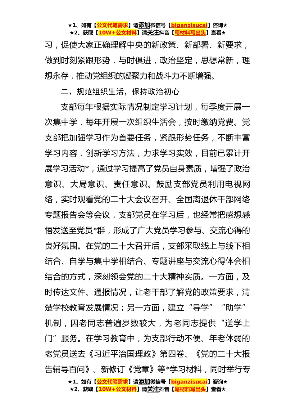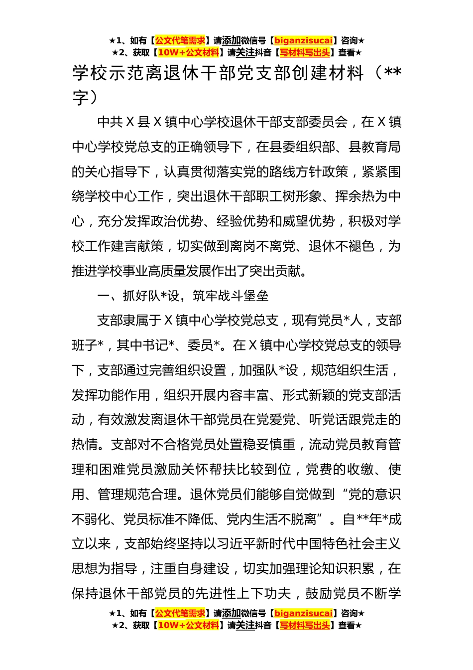 ★1、如有【公文代笔需求】请添加微信号【biganzisucai】咨询★★2、获取【10W+公文材料】请关注抖音【写材料写出头】查看★学校示范离退休干部党支部创建材料(**字)中共X县X镇中心学校退休干部支部委员会,在X镇中心学校党总支的正确领导下,在县委组织部、县教育局的关心指导下,认真贯彻落实党的路线方针政策,紧紧围绕学校中心工作,突出退休干部职工树形象、挥余热为中心,充分发挥政治优势、经验优势和威望优势,积极对学校工作建言献策,切实做到离岗不离党、退休不褪色,为推进学校事业高质量发展作出了突出贡献。一、抓好队*设,筑牢战斗堡垒支部隶属于X镇中心学校党总支,现有党员*人,支部班子*,其中书记*、委员*。在X镇中心学校党总支的领导下,支部通过完善组织设置,加强队*设,规范组织生活,发...