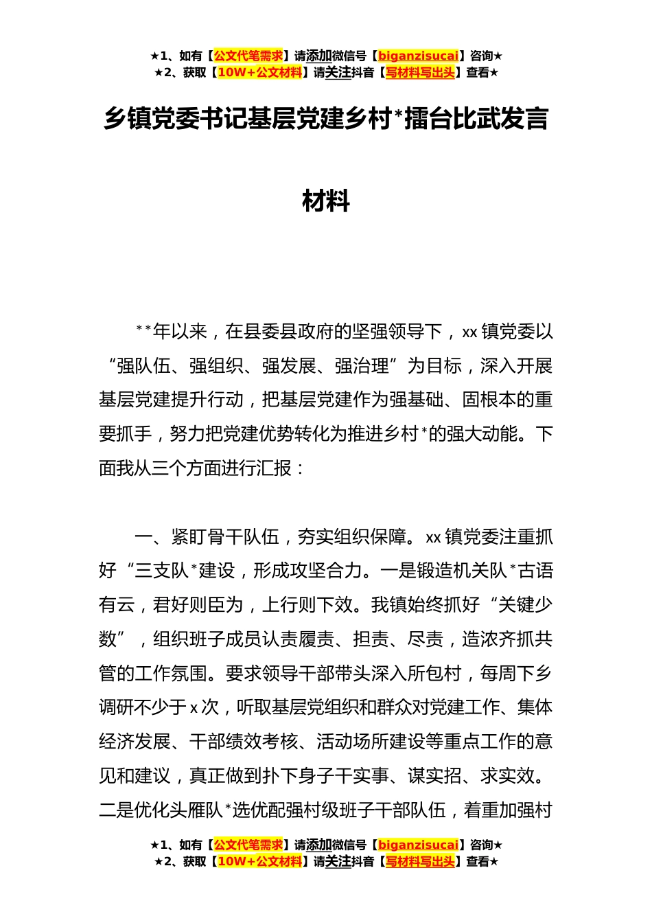 ★1、如有【公文代笔需求】请添加微信号【biganzisucai】咨询★★2、获取【10W+公文材料】请关注抖音【写材料写出头】查看★乡镇党委书记基层党建乡村*擂台比武发言材料**年以来,在县委县政府的坚强领导下,xx镇党委以“强队伍、强组织、强发展、强治理”为目标,深入开展基层党建提升行动,把基层党建作为强基础、固根本的重要抓手,努力把党建优势转化为推进乡村*的强大动能。下面我从三个方面进行汇报:一、紧盯骨干队伍,夯实组织保障。xx镇党委注重抓好“三支队*建设,形成攻坚合力。一是锻造机关队*古语有云,君好则臣为,上行则下效。我镇始终抓好“关键少数”,组织班子成员认责履责、担责、尽责,造浓齐抓共管的工作氛围。要求领导干部带头深入所包村,每周下乡调研不少于x次,听取基层党组织和群众对党...
