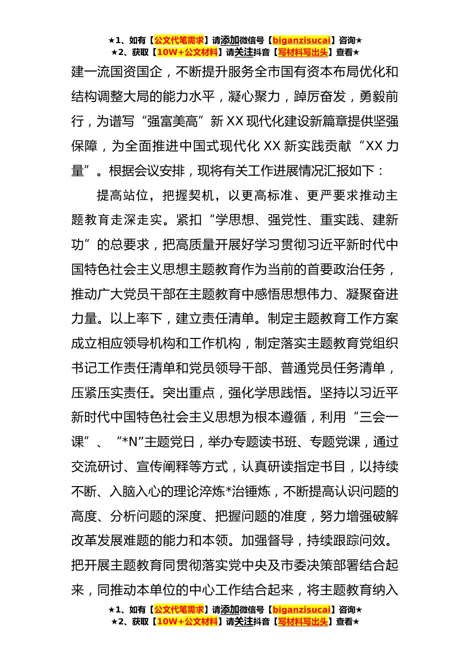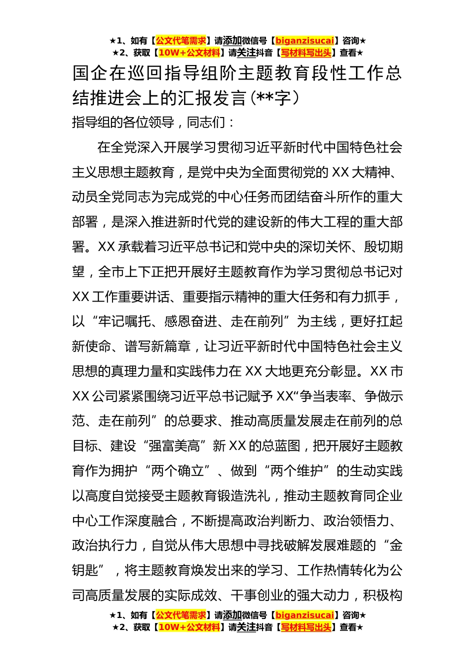★1、如有【公文代笔需求】请添加微信号【biganzisucai】咨询★★2、获取【10W+公文材料】请关注抖音【写材料写出头】查看★国企在巡回指导组阶主题教育段性工作总结推进会上的汇报发言(**字)指导组的各位领导,同志们:在全党深入开展学习贯彻习近平新时代中国特色社会主义思想主题教育,是党中央为全面贯彻党的XX大精神、动员全党同志为完成党的中心任务而团结奋斗所作的重大部署,是深入推进新时代党的建设新的伟大工程的重大部署。XX承载着习近平总书记和党中央的深切关怀、殷切期望,全市上下正把开展好主题教育作为学习贯彻总书记对XX工作重要讲话、重要指示精神的重大任务和有力抓手,以“牢记嘱托、感恩奋进、走在前列”为主线,更好扛起新使命、谱写新篇章,让习近平新时代中国特色社会主义思想的真理力...