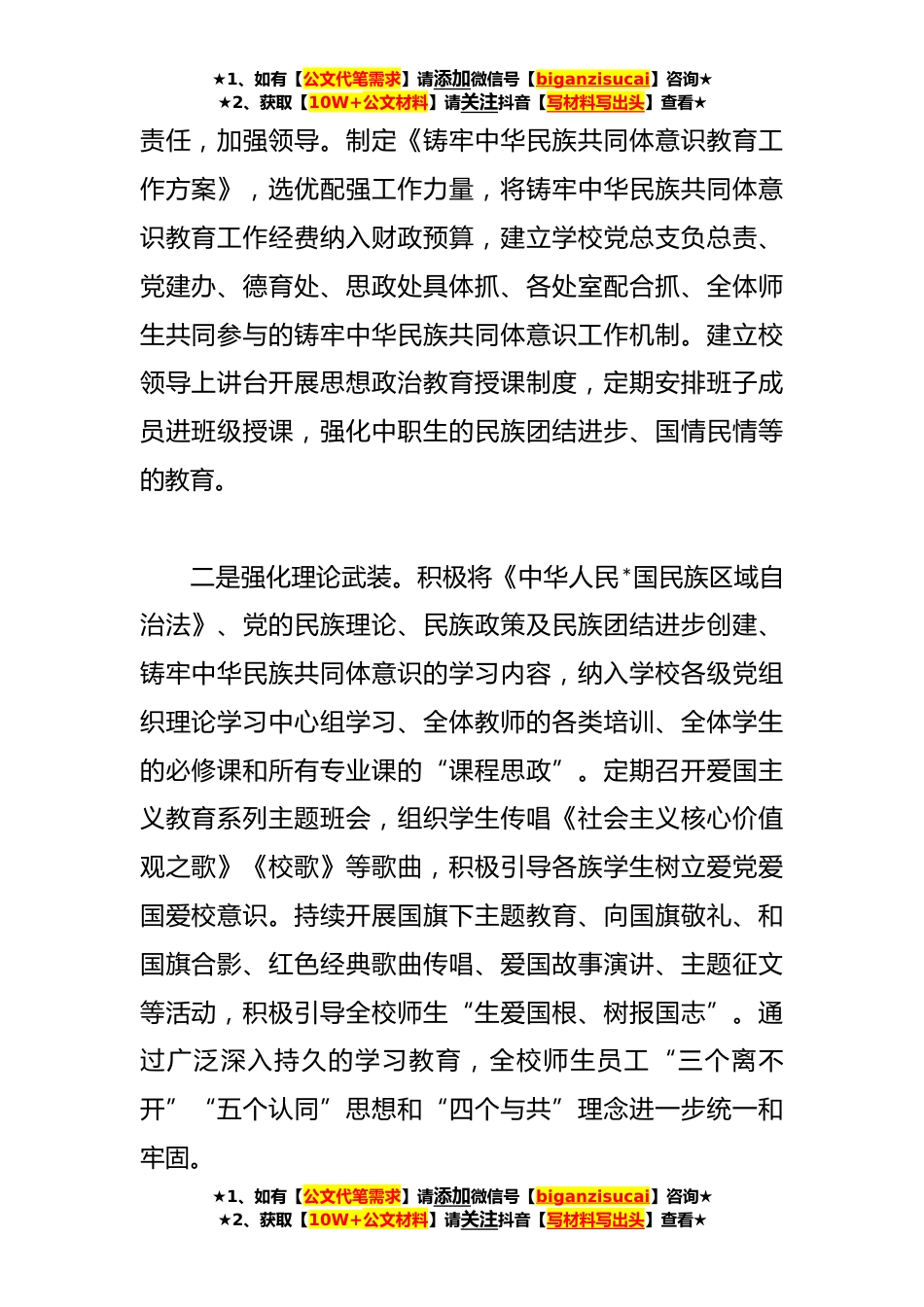 ★1、如有【公文代笔需求】请添加微信号【biganzisucai】咨询★★2、获取【10W+公文材料】请关注抖音【写材料写出头】查看★XX学校在铸牢中华民族共同体意识教育工作情况报告近年来,我校坚持以习近平新时代中国特色社会主义思想为指导,深入学习贯彻《关于全面深入持久开展民族团结进步创建工作铸牢中华民族共同体意识的意见》精神以铸牢中华民族共同体意识为主线,积极培育和践行社会主义核心价值观,坚持不懈开展中国特色社会主义和中国梦的宣传教育,引导各族学生牢固树立“三个离不开”思想,增强“五个认同”意识,切实维护各民族交往交流交融,推动民族团结进步创建,让各民族像石榴籽一样紧紧抱在一起,凝聚起*共筑中国梦的磅礴力量。一、坚持“三强化”,坚定正确的办学方向一是强化组织领导。学校将民族...