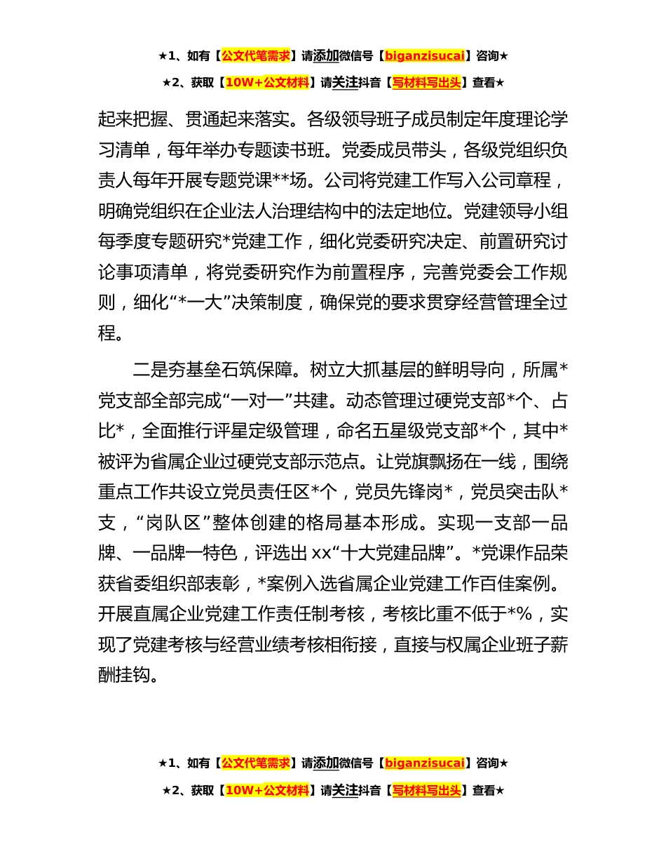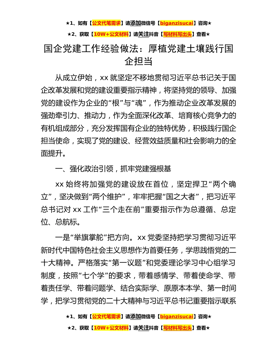 ★1、如有【公文代笔需求】请添加微信号【biganzisucai】咨询★★2、获取【10W+公文材料】请关注抖音【写材料写出头】查看★国企党建工作经验做法:厚植党建土壤践行国企担当从成立伊始,xx就坚定不移地贯彻习近平总书记关于国企改革发展和党的建设重要指示精神,将坚持党的领导、加强“”“”党的建设作为企业的根与魂,作为推动企业改革发展的强劲牵引力、推动力,作为全面深化改革、培育核心竞争力的有机组成部分,充分发挥国有企业的独特优势,积极践行国企担当使命,实现了党的建设、经营效益质量和社会影响力的全面提升。一、强化政治引领,抓牢党建强根基xx“始终将加强党的建设放在首位,坚定捍卫两个确”“”“”立,坚决做到两个维护,牢牢把握国之大者,把习近平总书记对xx“”工作三个走在前重要指示...