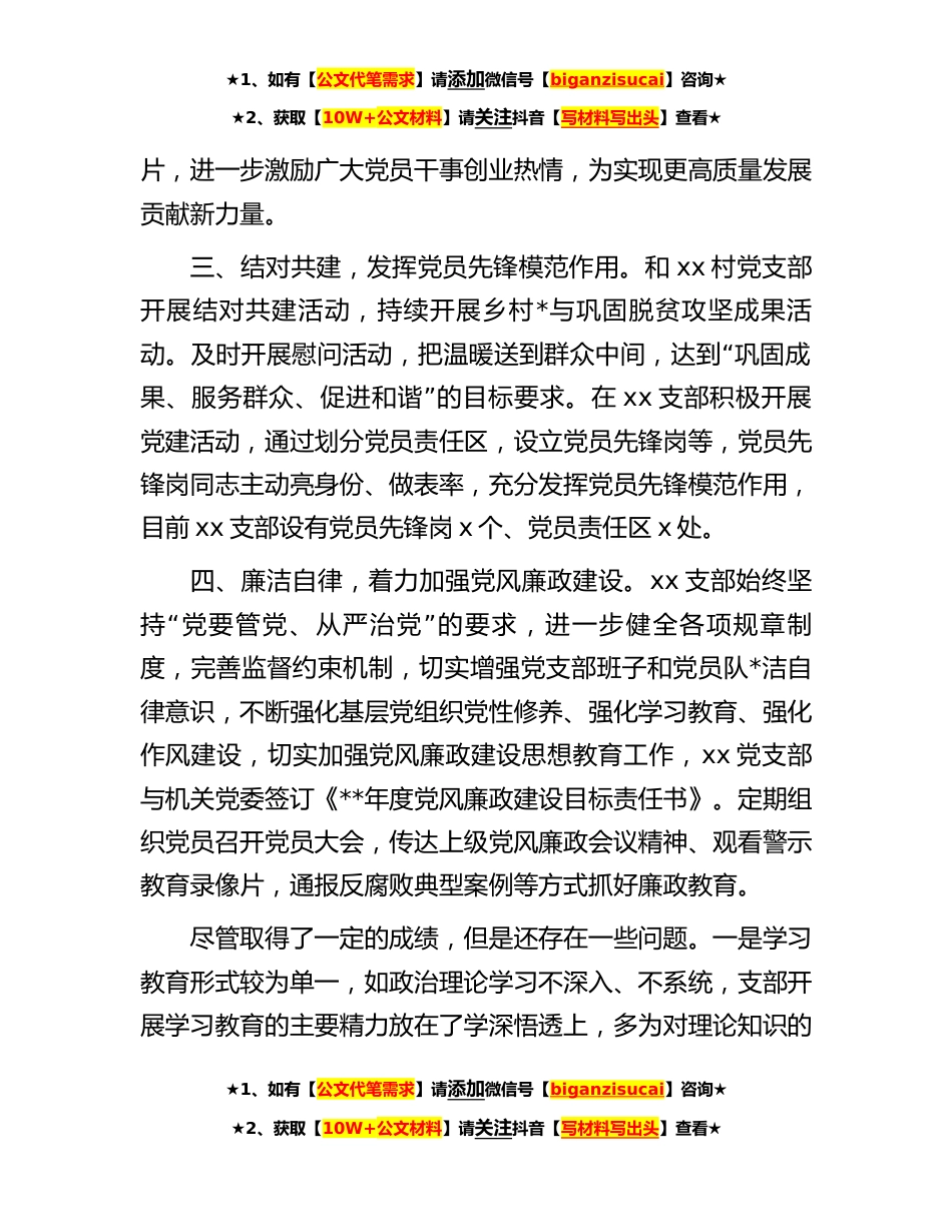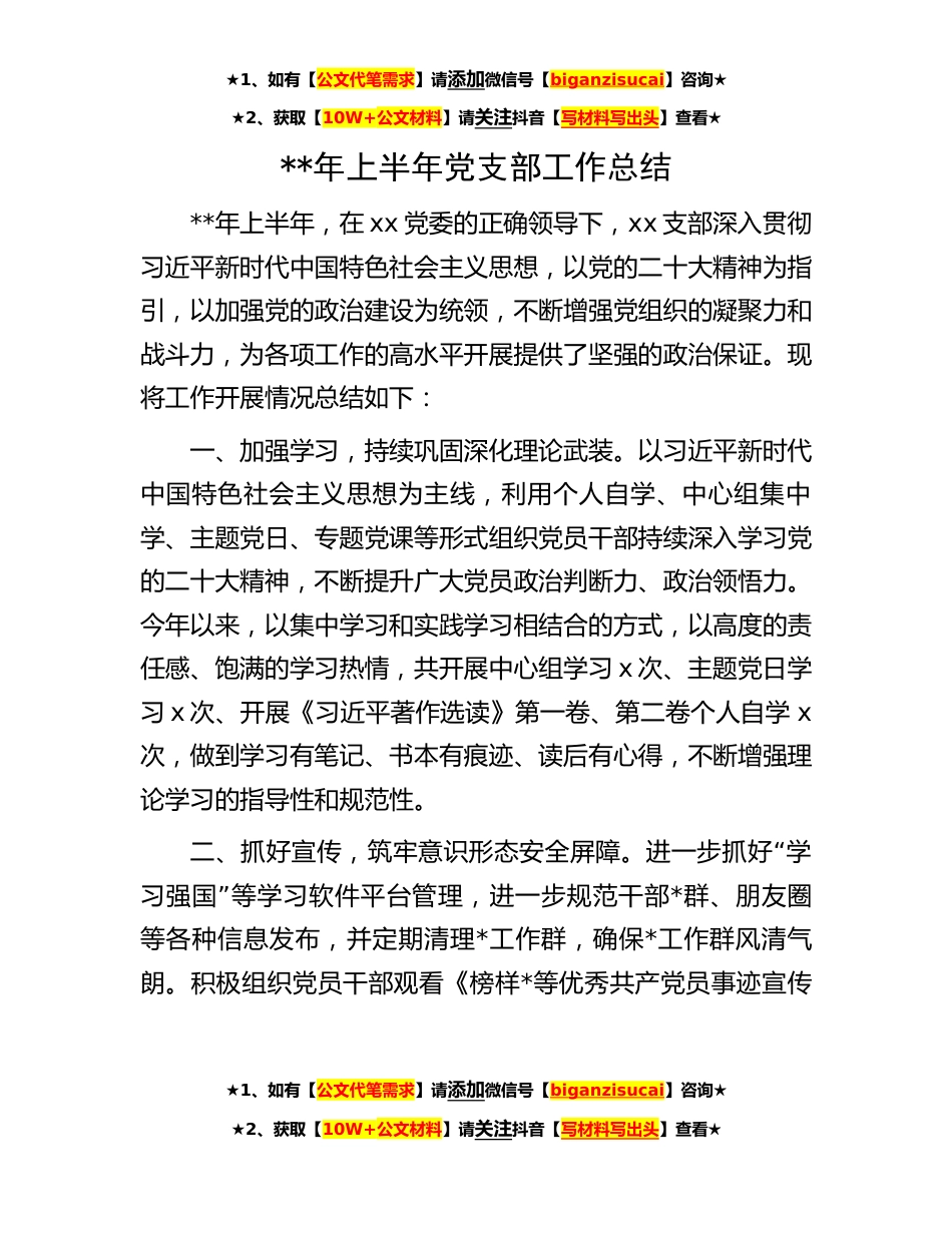 ★1、如有【公文代笔需求】请添加微信号【biganzisucai】咨询★★2、获取【10W+公文材料】请关注抖音【写材料写出头】查看★**年上半年党支部工作总结**年上半年,在xx党委的正确领导下,xx支部深入贯彻习近平新时代中国特色社会主义思想,以党的二十大精神为指引,以加强党的政治建设为统领,不断增强党组织的凝聚力和战斗力,为各项工作的高水平开展提供了坚强的政治保证。现将工作开展情况总结如下:一、加强学习,持续巩固深化理论武装。以习近平新时代中国特色社会主义思想为主线,利用个人自学、中心组集中学、主题党日、专题党课等形式组织党员干部持续深入学习党的二十大精神,不断提升广大党员政治判断力、政治领悟力。今年以来,以集中学习和实践学习相结合的方式,以高度的责任感、饱满的学习热情,共...