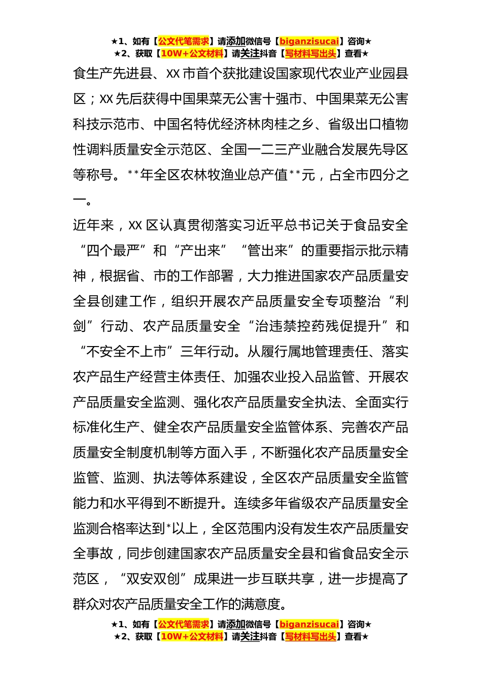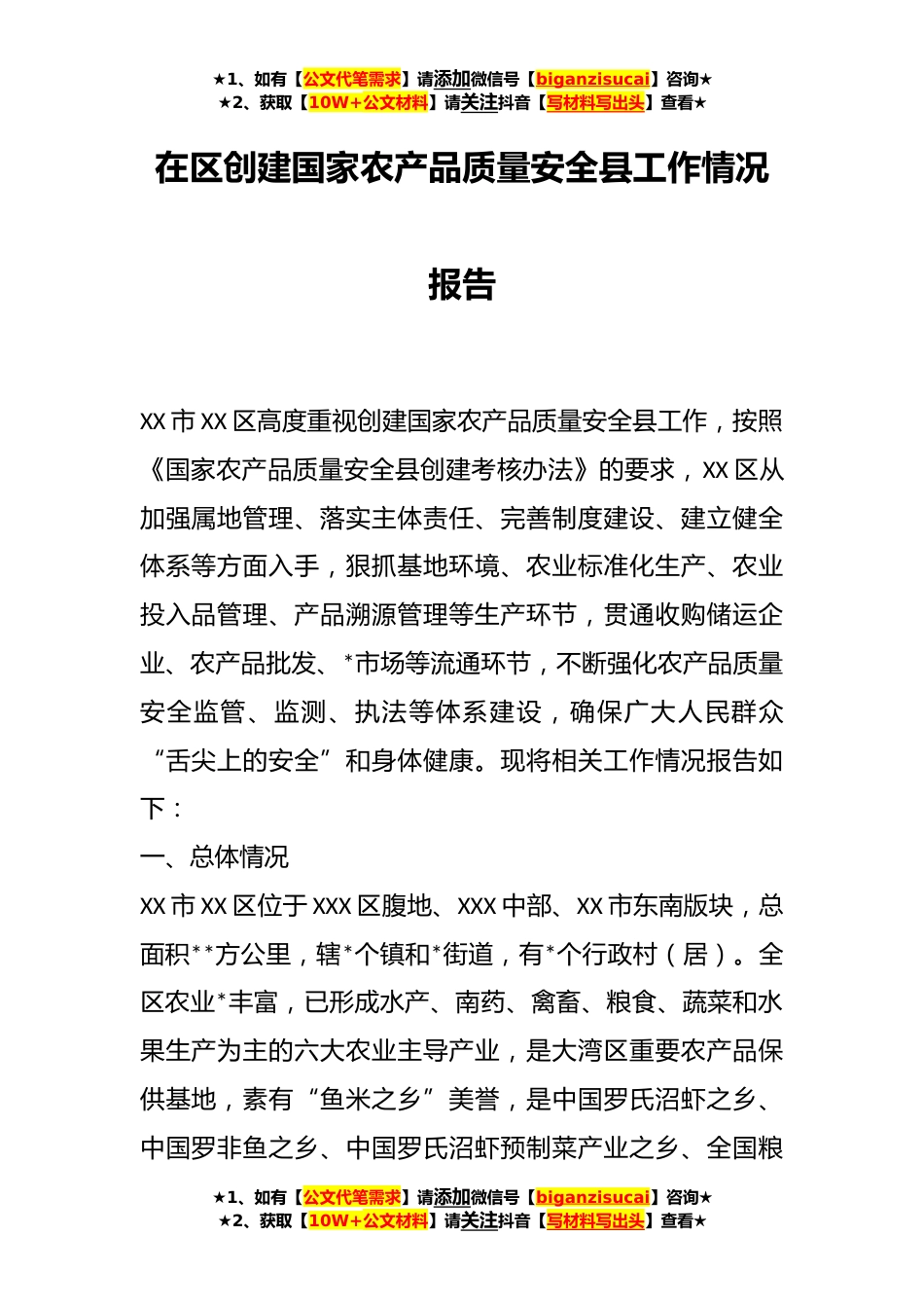 ★1、如有【公文代笔需求】请添加微信号【biganzisucai】咨询★★2、获取【10W+公文材料】请关注抖音【写材料写出头】查看★在区创建国家农产品质量安全县工作情况报告XX市XX区高度重视创建国家农产品质量安全县工作,按照《国家农产品质量安全县创建考核办法》的要求,XX区从加强属地管理、落实主体责任、完善制度建设、建立健全体系等方面入手,狠抓基地环境、农业标准化生产、农业投入品管理、产品溯源管理等生产环节,贯通收购储运企业、农产品批发、*市场等流通环节,不断强化农产品质量安全监管、监测、执法等体系建设,确保广大人民群众“舌尖上的安全”和身体健康。现将相关工作情况报告如下:一、总体情况XX市XX区位于XXX区腹地、XXX中部、XX市东南版块,总面积**方公里,辖*个镇和*街道,有*个行政村(...