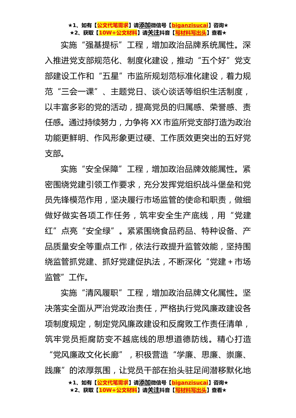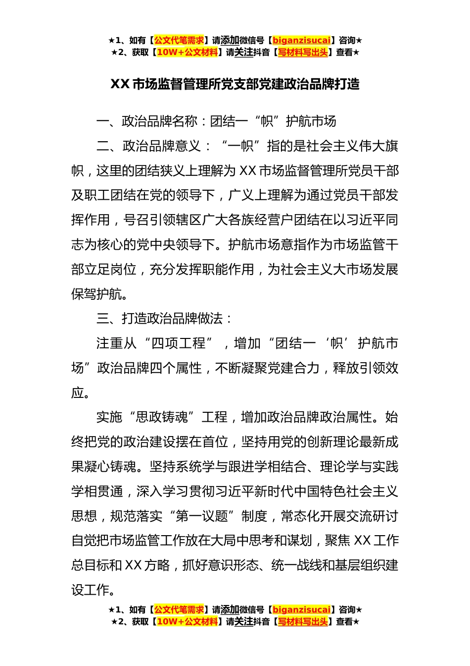 ★1、如有【公文代笔需求】请添加微信号【biganzisucai】咨询★★2、获取【10W+公文材料】请关注抖音【写材料写出头】查看★XX市场监督管理所党支部党建政治品牌打造一、政治品牌名称:团结一“帜”护航市场二、政治品牌意义:“一帜”指的是社会主义伟大旗帜,这里的团结狭义上理解为XX市场监督管理所党员干部及职工团结在党的领导下,广义上理解为通过党员干部发挥作用,号召引领辖区广大各族经营户团结在以习近平同志为核心的党中央领导下。护航市场意指作为市场监管干部立足岗位,充分发挥职能作用,为社会主义大市场发展保驾护航。三、打造政治品牌做法:注重从“四项工程”,增加“团结一‘帜’护航市场”政治品牌四个属性,不断凝聚党建合力,释放引领效应。实施“思政铸魂”工程,增加政治品牌政治属性。...