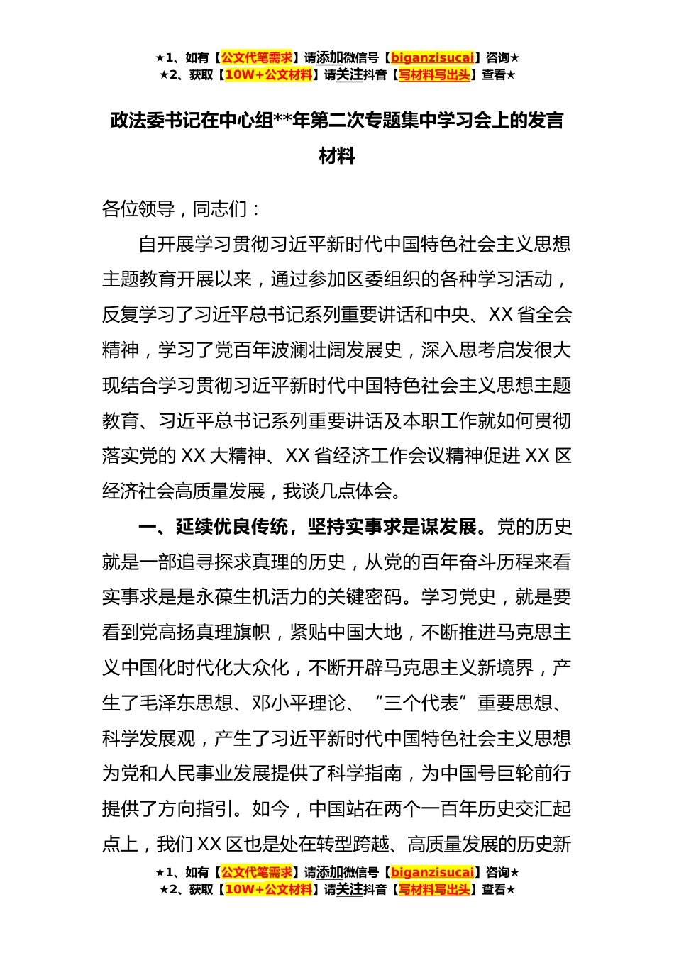 ★1、如有【公文代笔需求】请添加微信号【biganzisucai】咨询★★2、获取【10W+公文材料】请关注抖音【写材料写出头】查看★政法委书记在中心组**年第二次专题集中学习会上的发言材料各位领导,同志们:自开展学习贯彻习近平新时代中国特色社会主义思想主题教育开展以来,通过参加区委组织的各种学习活动,反复学习了习近平总书记系列重要讲话和中央、XX省全会精神,学习了党百年波澜壮阔发展史,深入思考启发很大现结合学习贯彻习近平新时代中国特色社会主义思想主题教育、习近平总书记系列重要讲话及本职工作就如何贯彻落实党的XX大精神、XX省经济工作会议精神促进XX区经济社会高质量发展,我谈几点体会。一、延续优良传统,坚持实事求是谋发展。党的历史就是一部追寻探求真理的历史,从党的百年奋斗历程来看实...