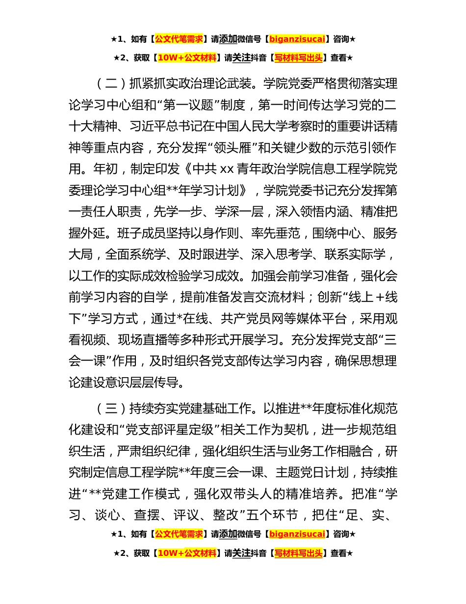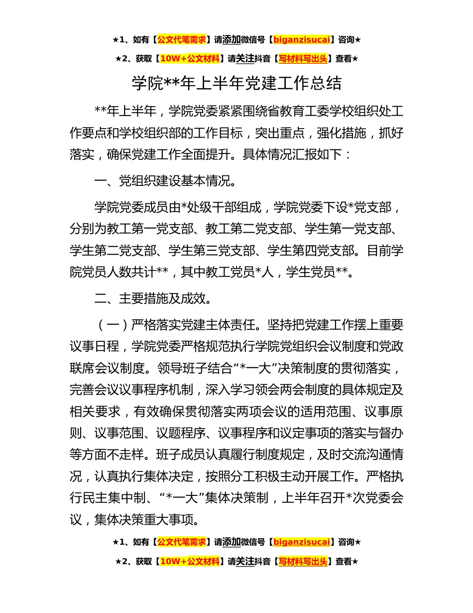 ★1、如有【公文代笔需求】请添加微信号【biganzisucai】咨询★★2、获取【10W+公文材料】请关注抖音【写材料写出头】查看★学院**年上半年党建工作总结**年上半年,学院党委紧紧围绕省教育工委学校组织处工作要点和学校组织部的工作目标,突出重点,强化措施,抓好落实,确保党建工作全面提升。具体情况汇报如下:一、党组织建设基本情况。学院党委成员由*处级干部组成,学院党委下设*党支部,分别为教工第一党支部、教工第二党支部、学生第一党支部、学生第二党支部、学生第三党支部、学生第四党支部。目前学院党员人数共计**,其中教工党员*人,学生党员**。二、主要措施及成效。(一)严格落实党建主体责任。坚持把党建工作摆上重要议事日程,学院党委严格规范执行学院党组织会议制度和党政“联席会议制度。领...