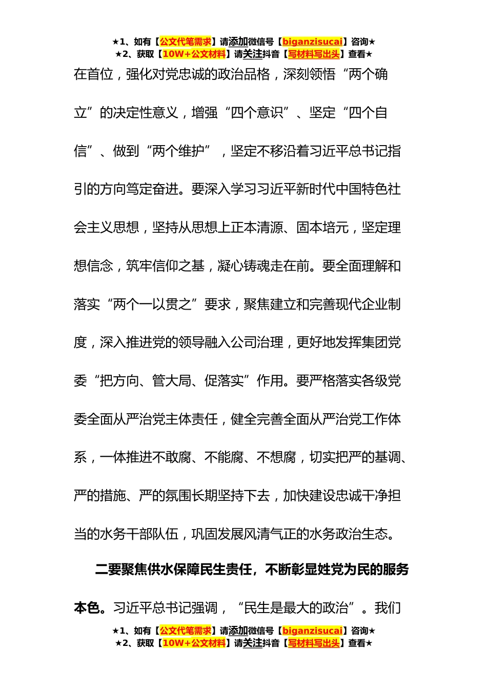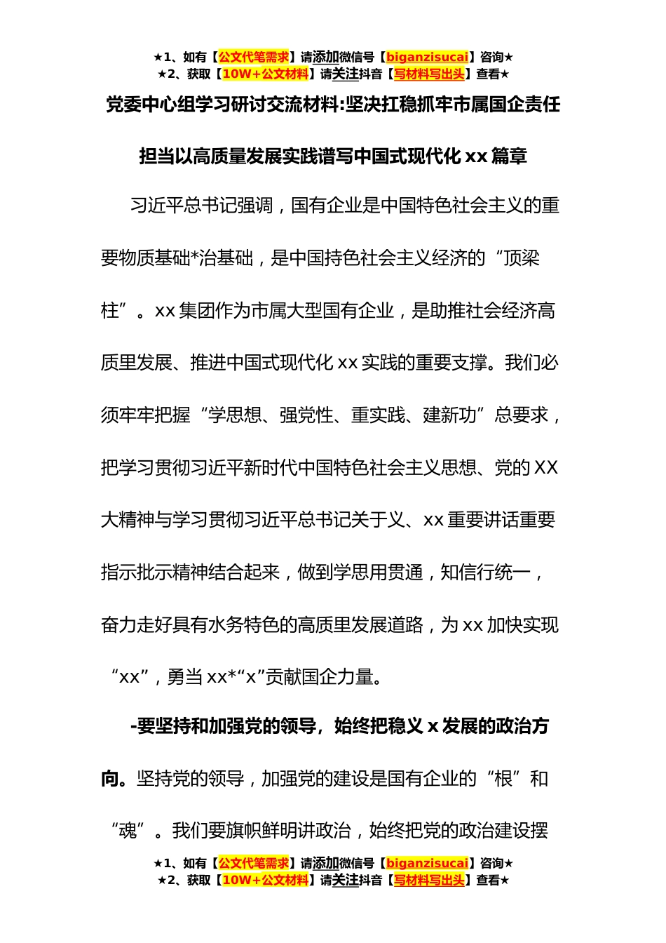 ★1、如有【公文代笔需求】请添加微信号【biganzisucai】咨询★★2、获取【10W+公文材料】请关注抖音【写材料写出头】查看★党委中心组学习研讨交流材料:坚决扛稳抓牢市属国企责任担当以高质量发展实践谱写中国式现代化xx篇章习近平总书记强调,国有企业是中国特色社会主义的重要物质基础*治基础,是中国持色社会主义经济的“顶梁柱”。xx集团作为市属大型国有企业,是助推社会经济高质里发展、推进中国式现代化xx实践的重要支撑。我们必须牢牢把握“学思想、强党性、重实践、建新功”总要求,把学习贯彻习近平新时代中国特色社会主义思想、党的XX大精神与学习贯彻习近平总书记关于义、xx重要讲话重要指示批示精神结合起来,做到学思用贯通,知信行统一,奋力走好具有水务特色的高质里发展道路,为xx加快实现“xx...
