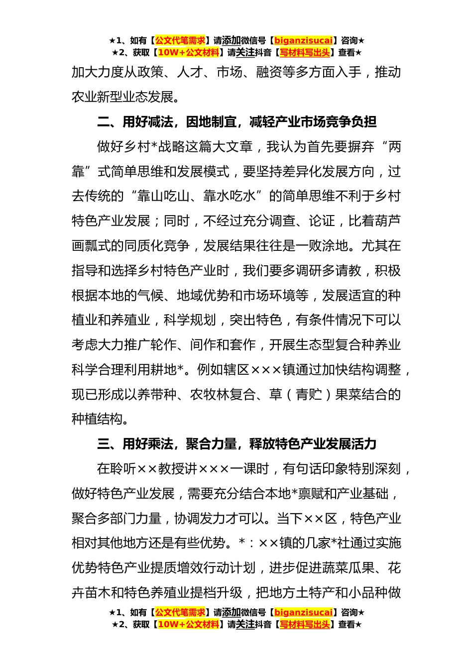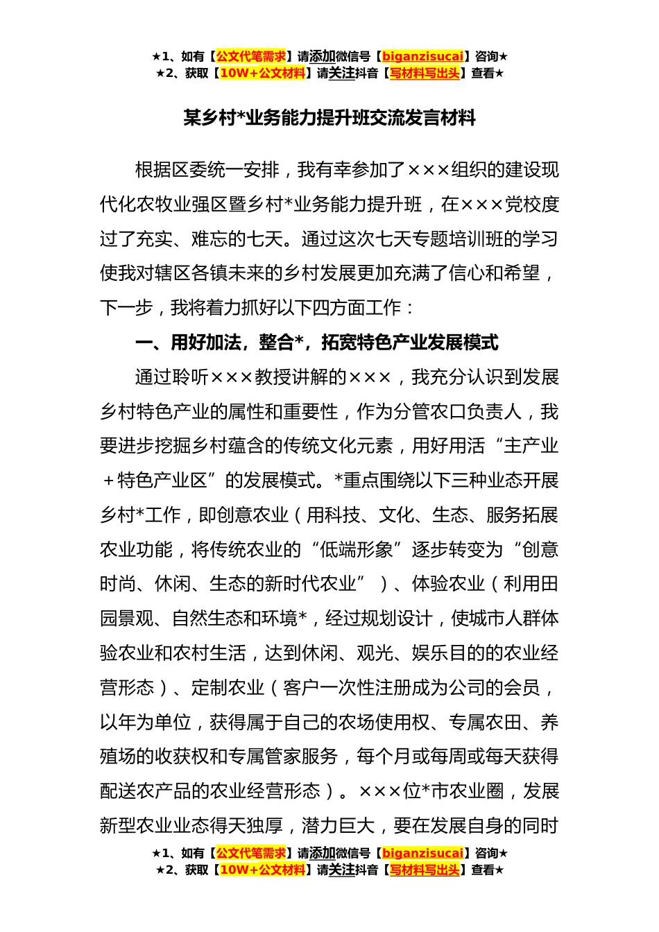★1、如有【公文代笔需求】请添加微信号【biganzisucai】咨询★★2、获取【10W+公文材料】请关注抖音【写材料写出头】查看★某乡村*业务能力提升班交流发言材料根据区委统一安排,我有幸参加了×××组织的建设现代化农牧业强区暨乡村*业务能力提升班,在×××党校度过了充实、难忘的七天。通过这次七天专题培训班的学习使我对辖区各镇未来的乡村发展更加充满了信心和希望,下一步,我将着力抓好以下四方面工作:一、用好加法,整合*,拓宽特色产业发展模式通过聆听×××教授讲解的×××,我充分认识到发展乡村特色产业的属性和重要性,作为分管农口负责人,我要进步挖掘乡村蕴含的传统文化元素,用好用活“主产业+特色产业区”的发展模式。*重点围绕以下三种业态开展乡村*工作,即创意农业(用科技、文化、生...