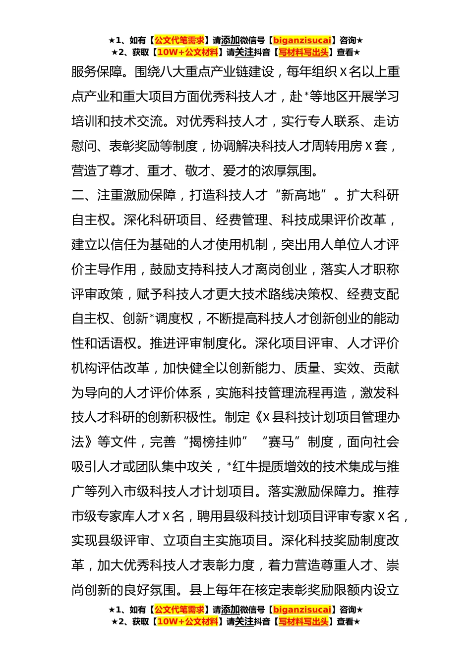 ★1、如有【公文代笔需求】请添加微信号【biganzisucai】咨询★★2、获取【10W+公文材料】请关注抖音【写材料写出头】查看★关于强化科技赋能助推乡村*近年来,X县认真贯彻省市部署要求,全面实施新时代“人才强县”战略,扎实履行科技人才队*设职责,深化人才发展体制机制改革,健全人才评价体系,统筹用好科技人才大力支持人才创新创业,不断激发人才活力,为乡村*提供了强有力的科技人才支撑。一、突出政治引领,凝聚科技人才“向心力”。明确责任分工。制定县委人才工作领导小组及成员单位职责和工作规则,细化分解年度重点任务,完善推进措施,逐项建立责任清单,靠实责任主体。定期召开县委人才工作领导小组会议,研究部署、调度推进科技人才重点工作。建立县级领导联系专家和重点人才项目常委负责制度,由X...