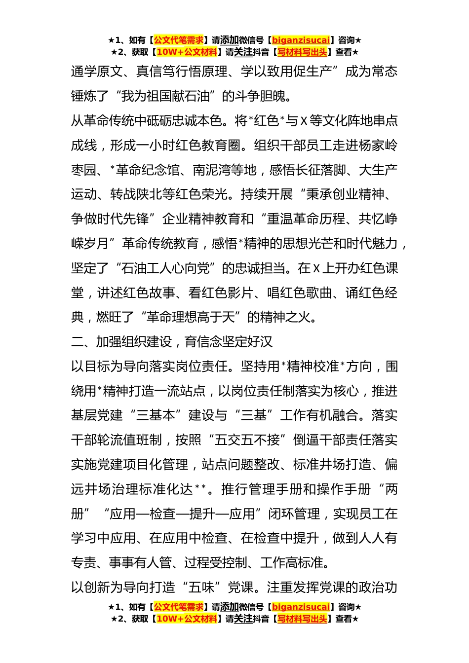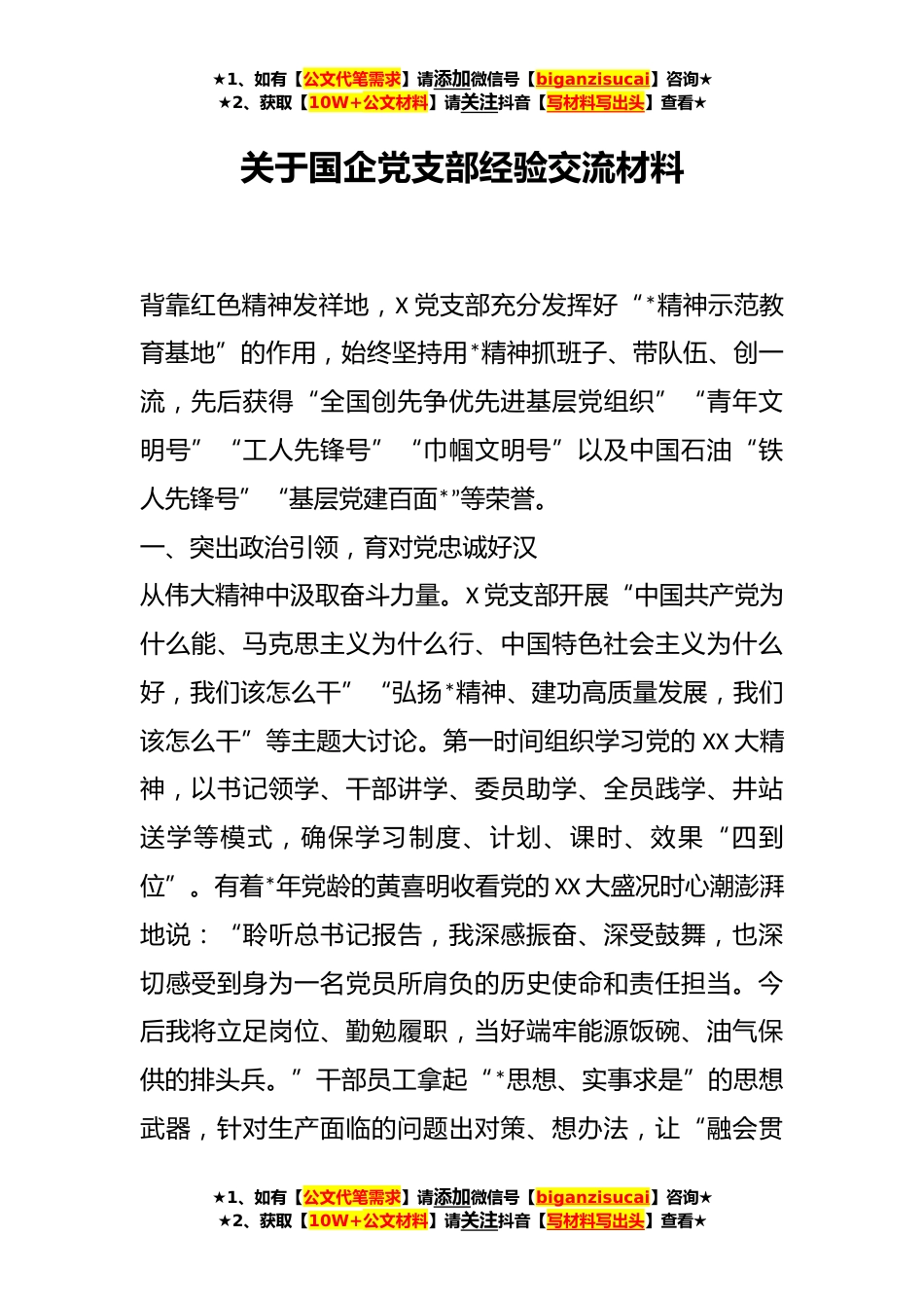 ★1、如有【公文代笔需求】请添加微信号【biganzisucai】咨询★★2、获取【10W+公文材料】请关注抖音【写材料写出头】查看★关于国企党支部经验交流材料背靠红色精神发祥地,X党支部充分发挥好“*精神示范教育基地”的作用,始终坚持用*精神抓班子、带队伍、创一流,先后获得“全国创先争优先进基层党组织”“青年文明号”“工人先锋号”“巾帼文明号”以及中国石油“铁人先锋号”“基层党建百面*”等荣誉。一、突出政治引领,育对党忠诚好汉从伟大精神中汲取奋斗力量。X党支部开展“中国共产党为什么能、马克思主义为什么行、中国特色社会主义为什么好,我们该怎么干”“弘扬*精神、建功高质量发展,我们该怎么干”等主题大讨论。第一时间组织学习党的XX大精神,以书记领学、干部讲学、委员助学、全员践学、井站...