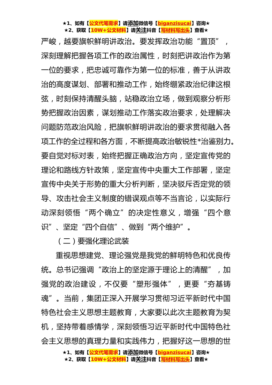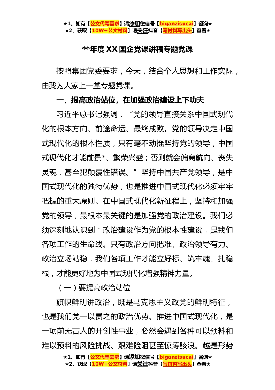★1、如有【公文代笔需求】请添加微信号【biganzisucai】咨询★★2、获取【10W+公文材料】请关注抖音【写材料写出头】查看★**年度XX国企党课讲稿专题党课按照集团党委要求,今天,结合个人思想和工作实际,由我为大家上一堂专题党课。一、提高政治站位,在加强政治建设上下功夫习近平总书记强调:“党的领导直接关系中国式现代化的根本方向、前途命运、最终成败。党的领导决定中国式现代化的根本性质,只有毫不动摇坚持党的领导,中国式现代化才能前景*、繁荣兴盛;否则就会偏离航向、丧失灵魂,甚至犯颠覆性错误。”坚持中国共产党领导,是中国式现代化的独特优势,也是推进中国式现代化必须牢牢把握的重大原则。在中国式现代化新征程上,坚持和加强党的领导,最根本最关键的是加强党的政治建设。我们必须深刻地...