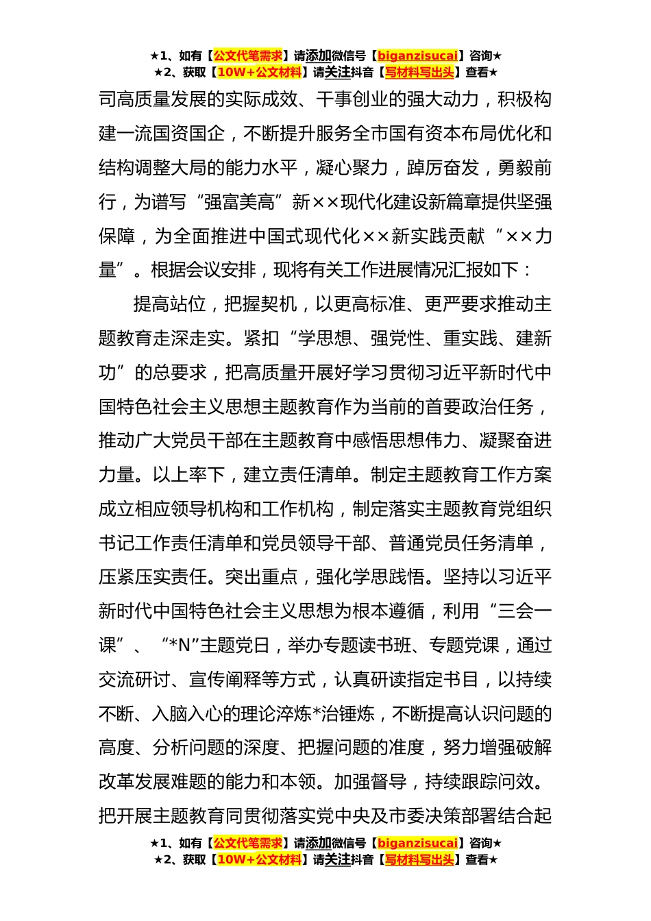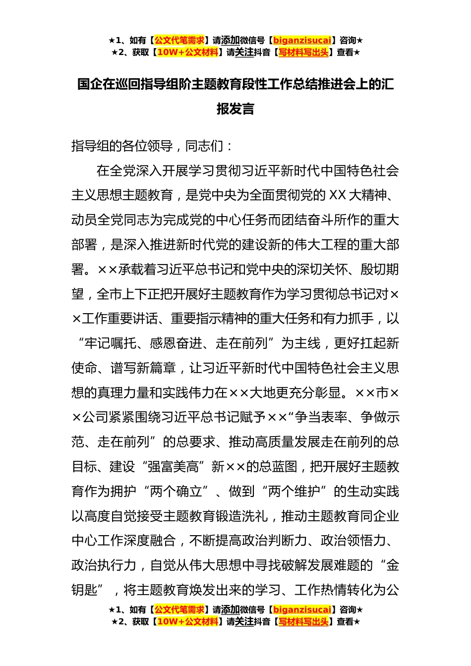 ★1、如有【公文代笔需求】请添加微信号【biganzisucai】咨询★★2、获取【10W+公文材料】请关注抖音【写材料写出头】查看★国企在巡回指导组阶主题教育段性工作总结推进会上的汇报发言指导组的各位领导,同志们:在全党深入开展学习贯彻习近平新时代中国特色社会主义思想主题教育,是党中央为全面贯彻党的XX大精神、动员全党同志为完成党的中心任务而团结奋斗所作的重大部署,是深入推进新时代党的建设新的伟大工程的重大部署。××承载着习近平总书记和党中央的深切关怀、殷切期望,全市上下正把开展好主题教育作为学习贯彻总书记对××工作重要讲话、重要指示精神的重大任务和有力抓手,以“牢记嘱托、感恩奋进、走在前列”为主线,更好扛起新使命、谱写新篇章,让习近平新时代中国特色社会主义思想的真理力量...