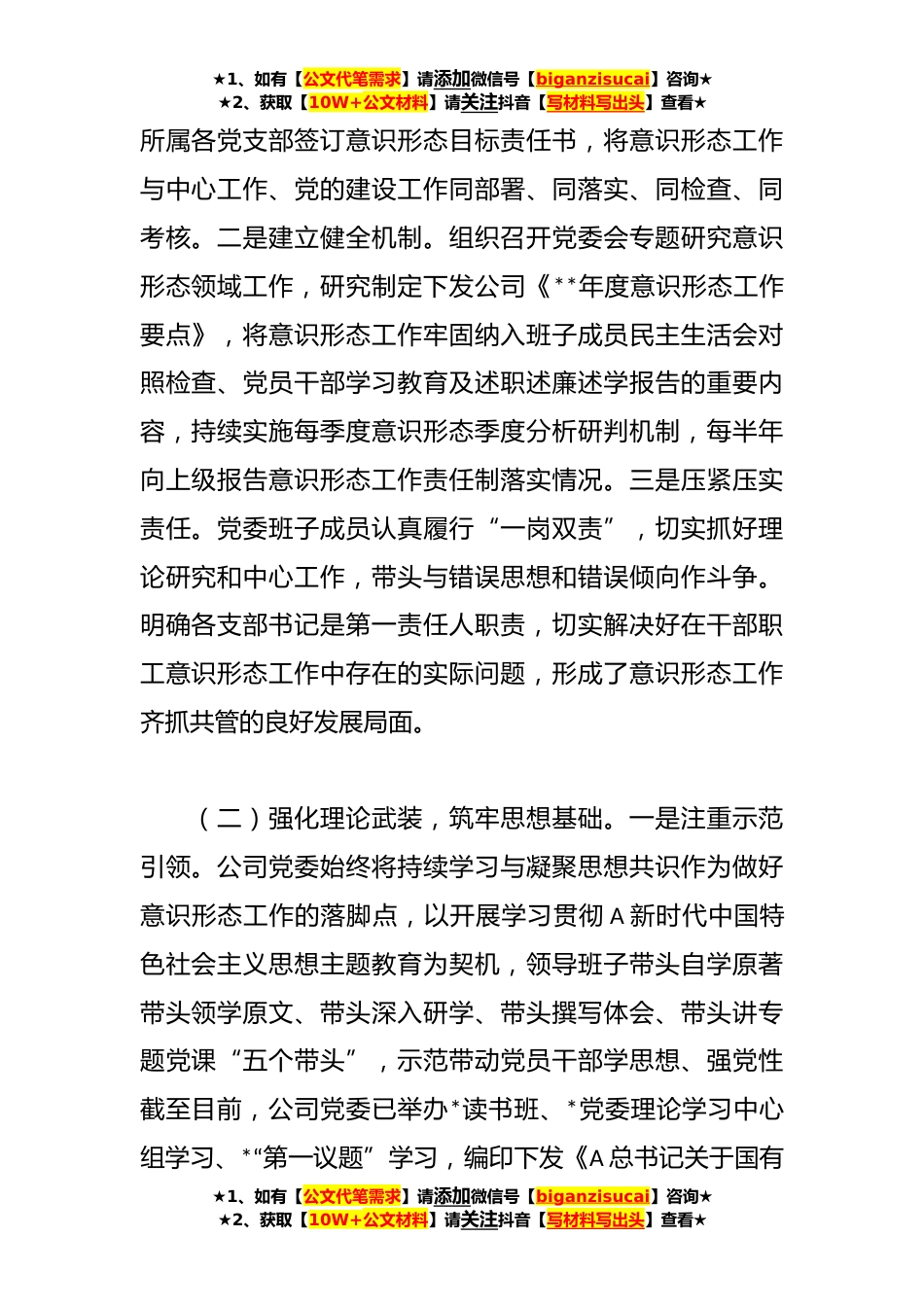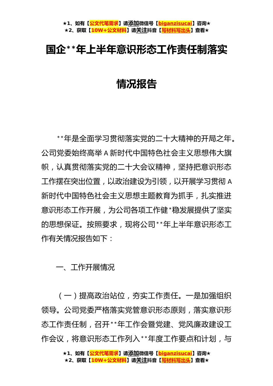 ★1、如有【公文代笔需求】请添加微信号【biganzisucai】咨询★★2、获取【10W+公文材料】请关注抖音【写材料写出头】查看★国企**年上半年意识形态工作责任制落实情况报告**年是全面学习贯彻落实党的二十大精神的开局之年。公司党委始终高举A新时代中国特色社会主义思想伟大旗帜,认真贯彻落实党的二十大会议精神,坚持把意识形态工作摆在突出位置,以政治建设为引领,以开展学习贯彻A新时代中国特色社会主义思想主题教育为抓手,扎实推进意识形态工作开展,为公司各项工作健*稳发展提供了坚实的思想保证。按照要求,现将公司**年上半年意识形态工作有关情况报告如下:一、工作开展情况(一)提高政治站位,夯实工作责任。一是加强组织领导。公司党委严格落实党管意识形态原则,落实意识形态工作责任制,召开**年...
