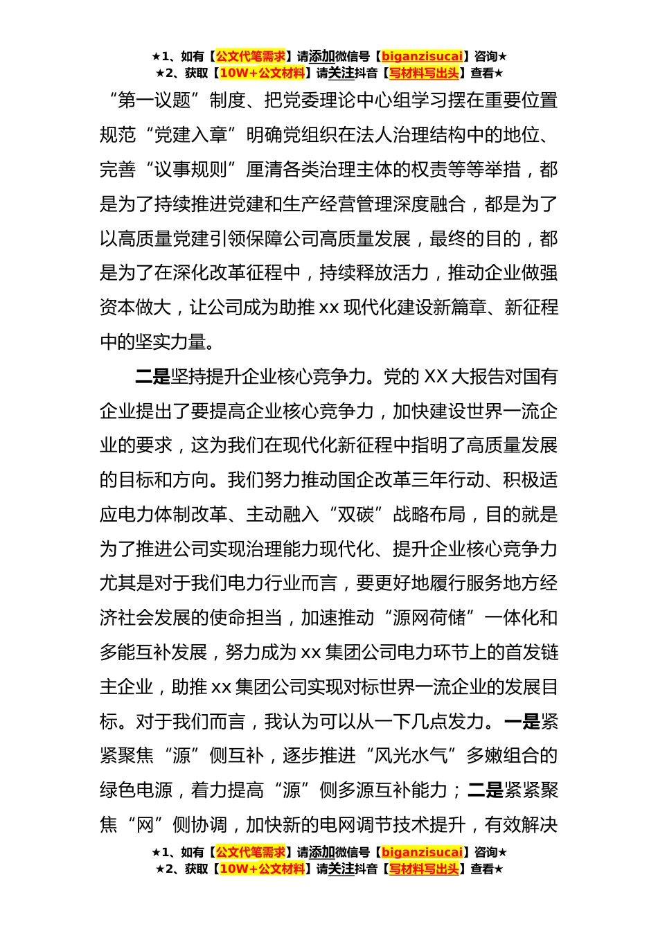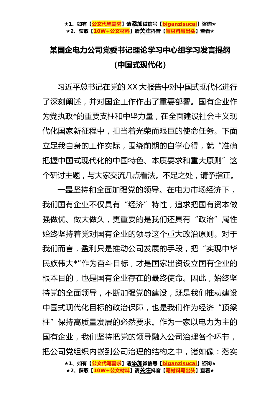 ★1、如有【公文代笔需求】请添加微信号【biganzisucai】咨询★★2、获取【10W+公文材料】请关注抖音【写材料写出头】查看★某国企电力公司党委书记理论学习中心组学习发言提纲(中国式现代化)习近平总书记在党的XX大报告中对中国式现代化进行了深刻阐述,并对国企工作作出了重要部署。国有企业作为党执政*的重要支柱和中坚力量,在全面建设社会主义现代化国家新征程中,担当着光荣而艰巨的使命任务。下面立足我自身的工作实际,围绕前期的自学心得,就“准确把握中国式现代化的中国特色、本质要求和重大原则”这个研讨主题,与大家交流几点看法。不足之处,请予指正。一是坚持和全面加强党的领导。在电力市场经济下,我们国有企业不仅具有“经济”特性,追求把国有资本做强做优、做大做久,更重要的是我们还具有...