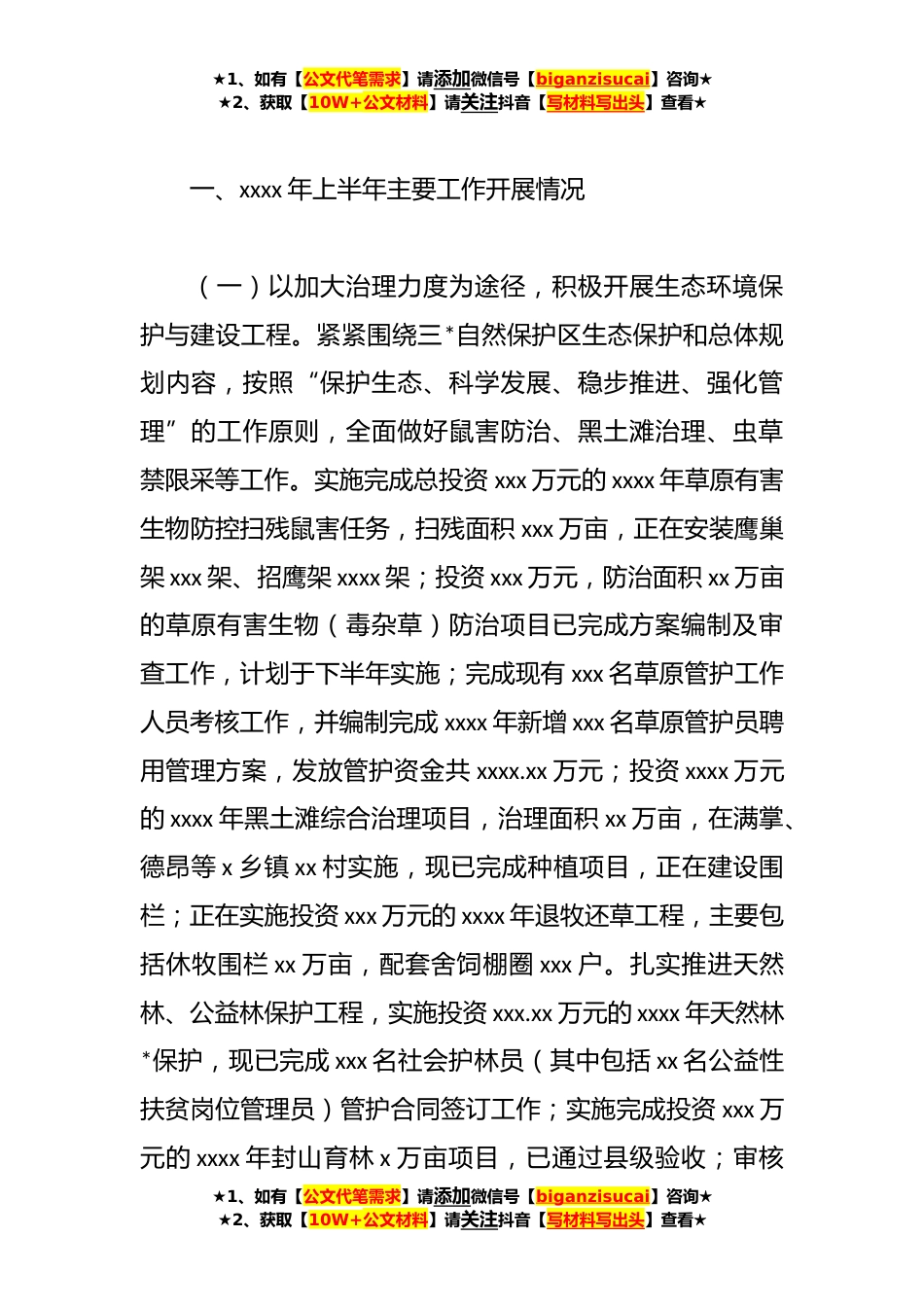 ★1、如有【公文代笔需求】请添加微信号【biganzisucai】咨询★★2、获取【10W+公文材料】请关注抖音【写材料写出头】查看★在县人民政府上半年工作总结及下半年工作计划xxxx年上半年,在州委、州政府的正确领导下,紧紧围绕县委中心工作,通过县人大、政协的有效监督,全县以“两学一做”专题教育活动为总领,认真学习贯彻十八届四中、五中全会,省委十二届十次、十一次全体会议,州委第十一届八次全会精神,严格按照中央、省州关于加强党员干部党性修养、深入推进新形势下党的建设要求,将习近平总书记系列重要讲话精神贯穿于发展全县经济社会发展始末,完善了发展思路,明确了发展路径,保持了全县经济社会健*稳发展,为“十三五”规划顺利启动奠定了基础。上半年,预计实现国内生产总值xxxx.xx万元,同比增长x...