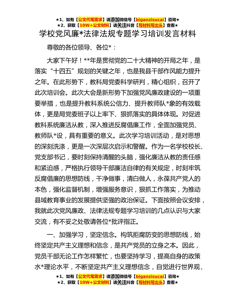 ★1、如有【公文代笔需求】请添加微信号【biganzisucai】咨询★★2、获取【10W+公文材料】请关注抖音【写材料写出头】查看★学校党风廉*法律法规专题学习培训发言材料尊敬的各位领导、各位*:大家下午好!**年是贯彻党的二十大精神的开局之年,是落实“十四五”规划的关键之年,也是我县干部作风能力提升之年。在此形势下,教科局党委科学研判,精心组织,召开了此次培训会。此次大会是新形势下加强党风廉政建设的一项重要举措,也是提升教科系统公信力、提升教师队*象的有效载体,更是局党委班子以上率下、狠抓落实的具体体现。对促进教科系统廉洁从教,深入推进反腐倡廉工作,全面加强党员、教师队*设,具有重要的意义。此次学习培训活动,是对思想的深刻洗涤,更是一次深层次启示和警醒。作为一名学校校长、党...