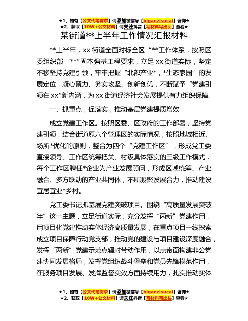 ★1、如有【公文代笔需求】请添加微信号【biganzisucai】咨询★★2、获取【10W+公文材料】请关注抖音【写材料写出头】查看★某街道**上半年工作情况汇报材料**上半年,xx街道全面对标全区“**工作体系,按照区委组织部“**”固本强基工程要求,立足xx街道实际,坚定不移坚持党建引领,牢牢把握“北部产业*,*生态家园”的发展定位,凝心聚力、务实攻坚、创新创优,不断赋予“党建引领在xx”新内涵,为xx街道经济社会发展提供有力组织保障。一、抓重点,促落实,推动基层党建提质增效成立党建工作区。按照区委、区政府的工作部署,坚持党建引领,结合街道原六个管理区的实际情况,按照地域相近、场所*优化的原则,整合为四个“党建工作区”,形成党工委直接领导、工作区统筹把关、村级具体落实的三级工作模式,每个...