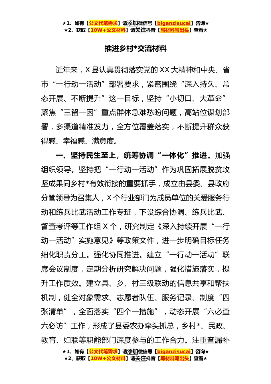 ★1、如有【公文代笔需求】请添加微信号【biganzisucai】咨询★★2、获取【10W+公文材料】请关注抖音【写材料写出头】查看★推进乡村*交流材料近年来,X县认真贯彻落实党的XX大精神和中央、省市“一行动一活动”部署要求,紧密围绕“深入持久、常态开展、不断提升”这一目标,坚持“小切口、大革命”聚焦“三留一困”重点群体急难愁盼问题,高站位谋划部署,多渠道精准发力,全方位覆盖落实,不断提升群众获得感、幸福感、满意度。一、坚持民生至上,统筹协调“一体化”推进。加强组织领导。坚持把“一行动一活动”作为巩固拓展脱贫攻坚成果同乡村*有效衔接的重要抓手,成立由县委、县政府分管领导为召集人,X个行业部门为成员单位的关爱服务行动和练兵比武活动工作专班,下设综合协调、练兵比武、督查考评等工作...