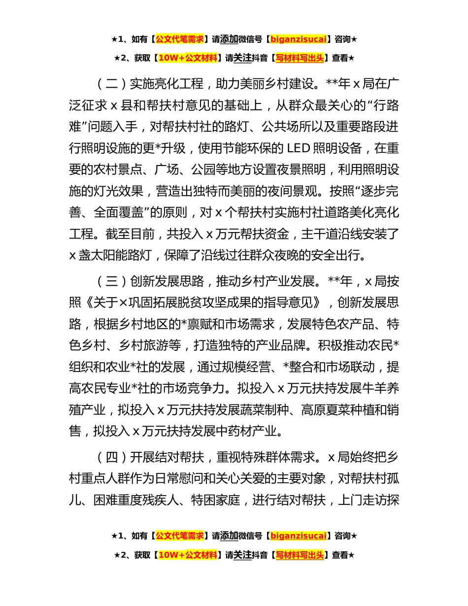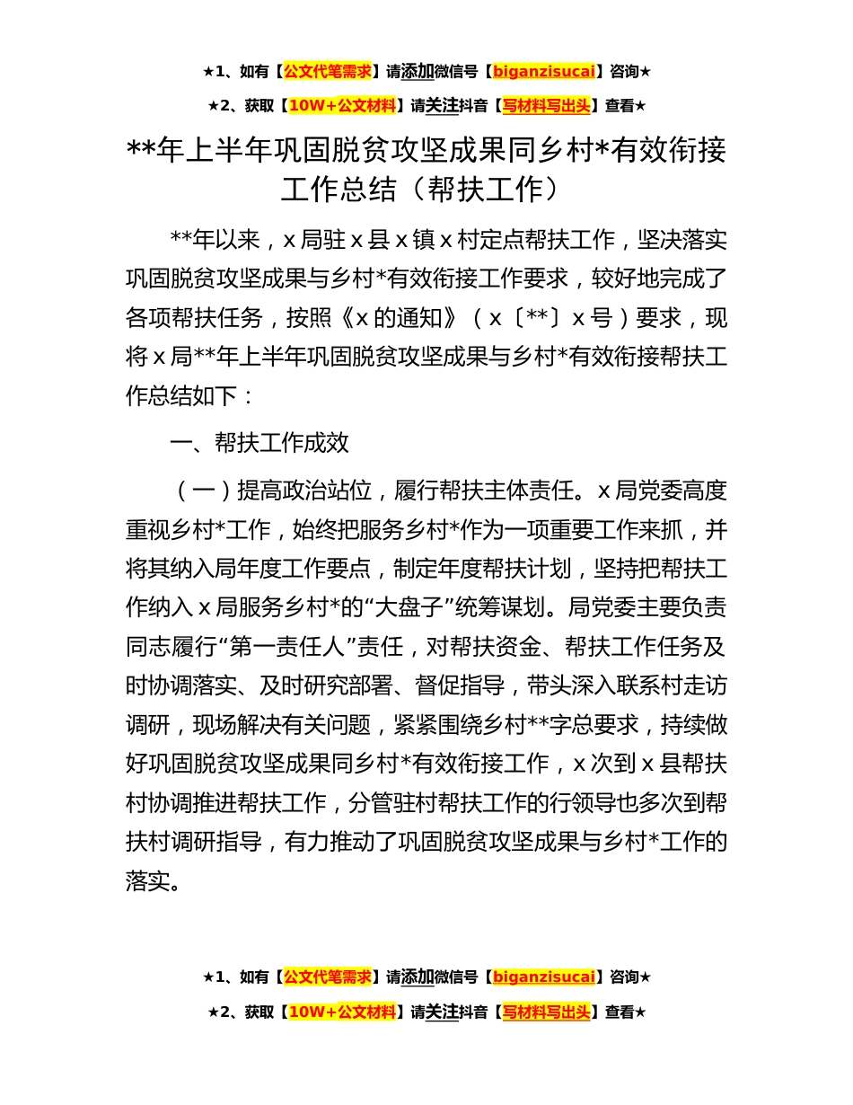 ★1、如有【公文代笔需求】请添加微信号【biganzisucai】咨询★★2、获取【10W+公文材料】请关注抖音【写材料写出头】查看★**年上半年巩固脱贫攻坚成果同乡村*有效衔接工作总结(帮扶工作)**年以来,x局驻x县x镇x村定点帮扶工作,坚决落实巩固脱贫攻坚成果与乡村*有效衔接工作要求,较好地完成了各项帮扶任务,按照《x的通知》(x〔**〕x号)要求,现将x局**年上半年巩固脱贫攻坚成果与乡村*有效衔接帮扶工作总结如下:一、帮扶工作成效(一)提高政治站位,履行帮扶主体责任。x局党委高度重视乡村*工作,始终把服务乡村*作为一项重要工作来抓,并将其纳入局年度工作要点,制定年度帮扶计划,坚持把帮扶工作纳入x局服务乡村*“”的大盘子统筹谋划。局党委主要负责“”同志履行第一责任人责任,对帮扶资金、帮扶...