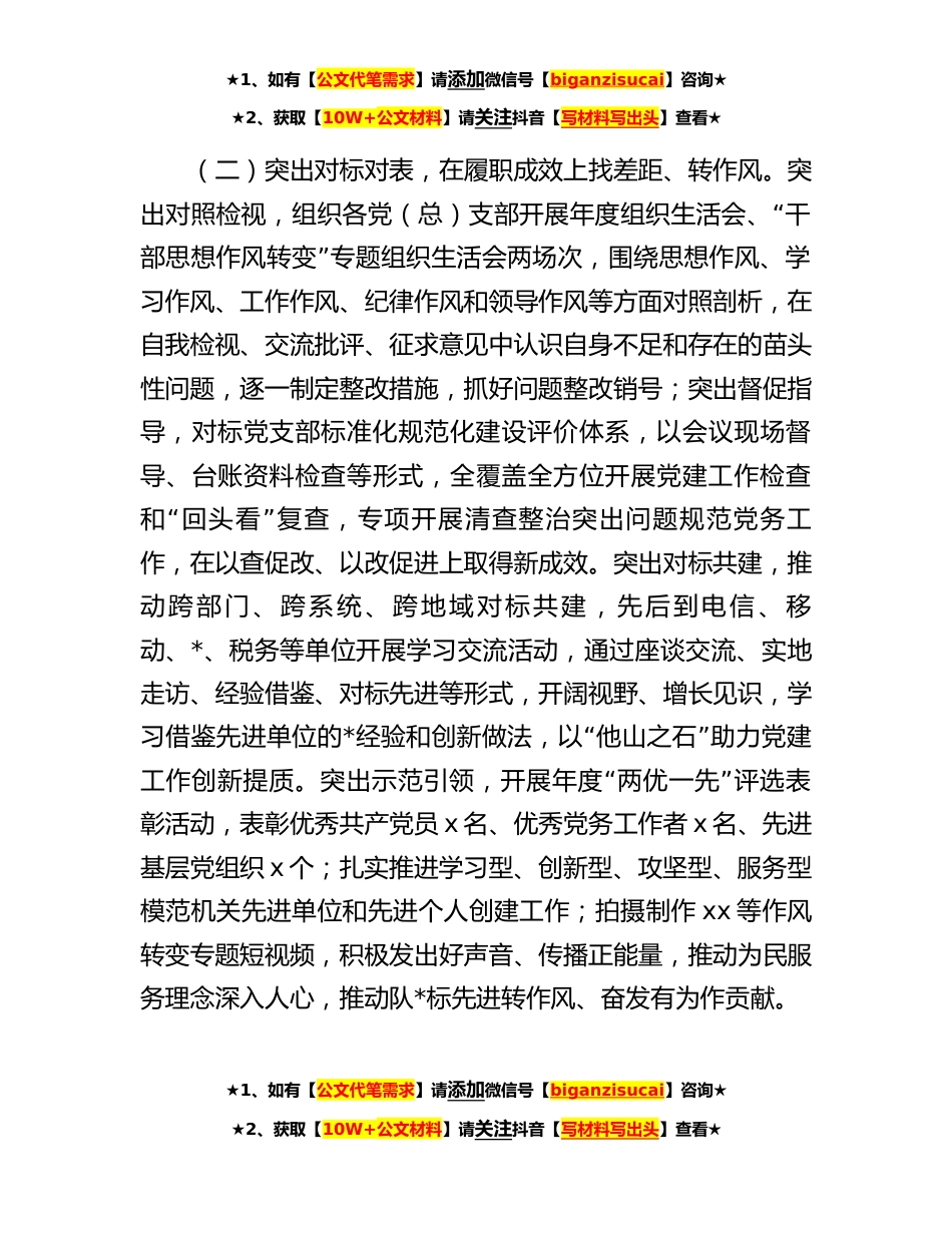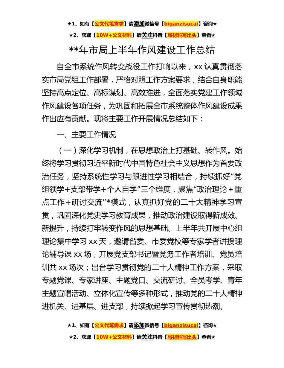 ★1、如有【公文代笔需求】请添加微信号【biganzisucai】咨询★★2、获取【10W+公文材料】请关注抖音【写材料写出头】查看★**年市局上半年作风建设工作总结自全市系统作风转变战役工作打响以来,xx认真贯彻落实市局党组工作部署,严格对照工作方案要求,结合自身职能坚持高点定位、高标谋划、高效推进,全面落实党建工作领域作风建设各项任务,为巩固和拓展全市系统整体作风建设成果作出应有贡献。现将主要工作开展情况总结如下:一、主要工作情况(一)深化学习机制,在思想政治上打基础、转作风。始终将学习贯彻习近平新时代中国特色社会主义思想作为首要政“治任务,坚持系统性学习与跟进性学习相结合,持续抓好党组领学+支部带学+”“个人自学三个维度,聚焦政治理论+重点工作+”研讨交流*模式,认真抓好党...