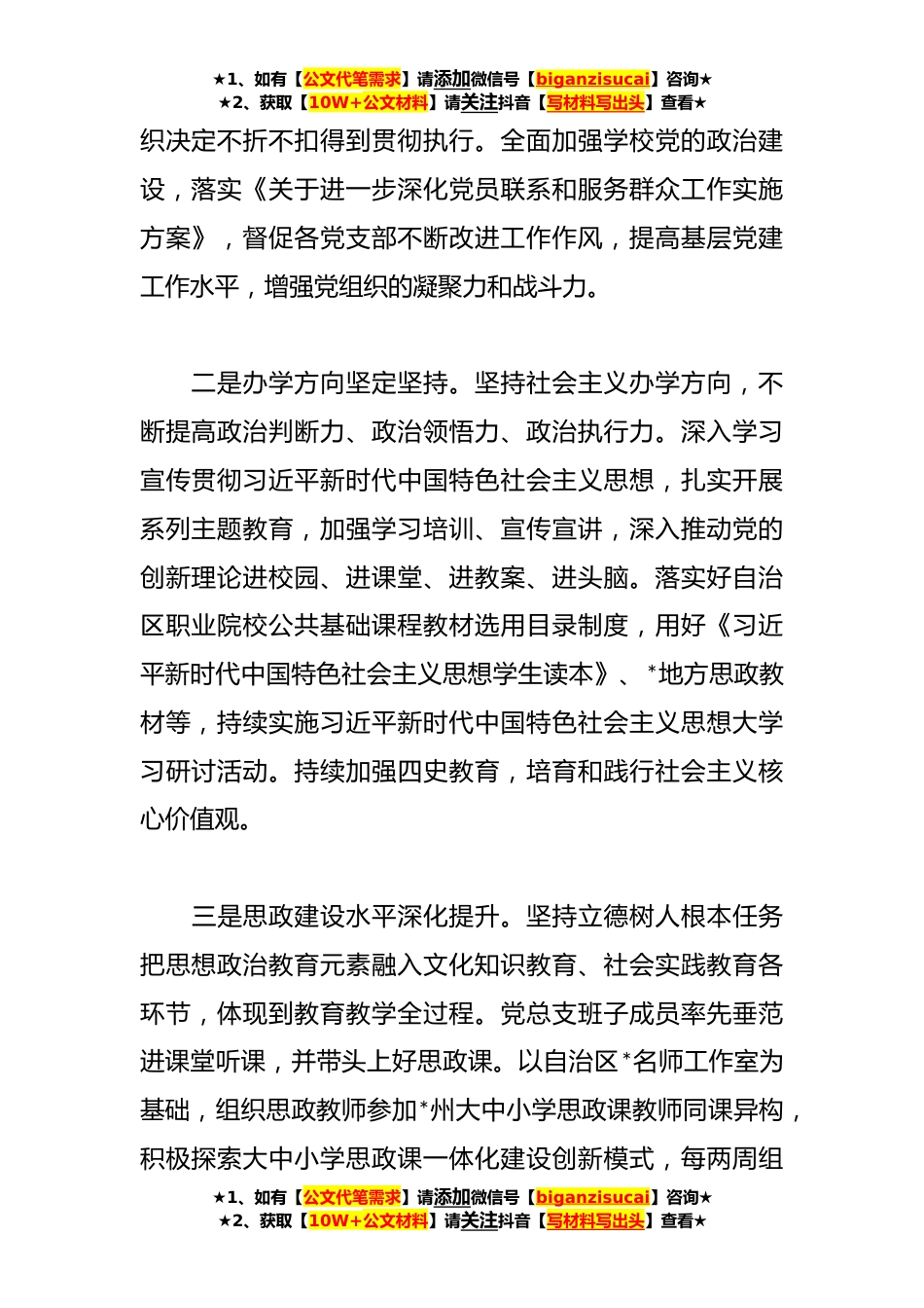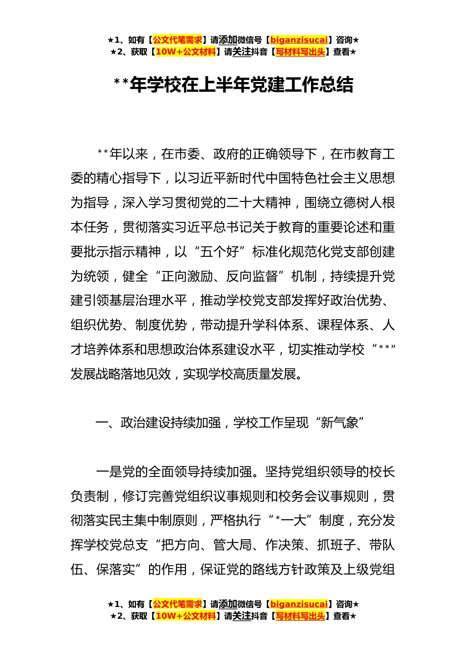 ★1、如有【公文代笔需求】请添加微信号【biganzisucai】咨询★★2、获取【10W+公文材料】请关注抖音【写材料写出头】查看★**年学校在上半年党建工作总结**年以来,在市委、政府的正确领导下,在市教育工委的精心指导下,以习近平新时代中国特色社会主义思想为指导,深入学习贯彻党的二十大精神,围绕立德树人根本任务,贯彻落实习近平总书记关于教育的重要论述和重要批示指示精神,以“五个好”标准化规范化党支部创建为统领,健全“正向激励、反向监督”机制,持续提升党建引领基层治理水平,推动学校党支部发挥好政治优势、组织优势、制度优势,带动提升学科体系、课程体系、人才培养体系和思想政治体系建设水平,切实推动学校“**”发展战略落地见效,实现学校高质量发展。一、政治建设持续加强,学校工作呈...