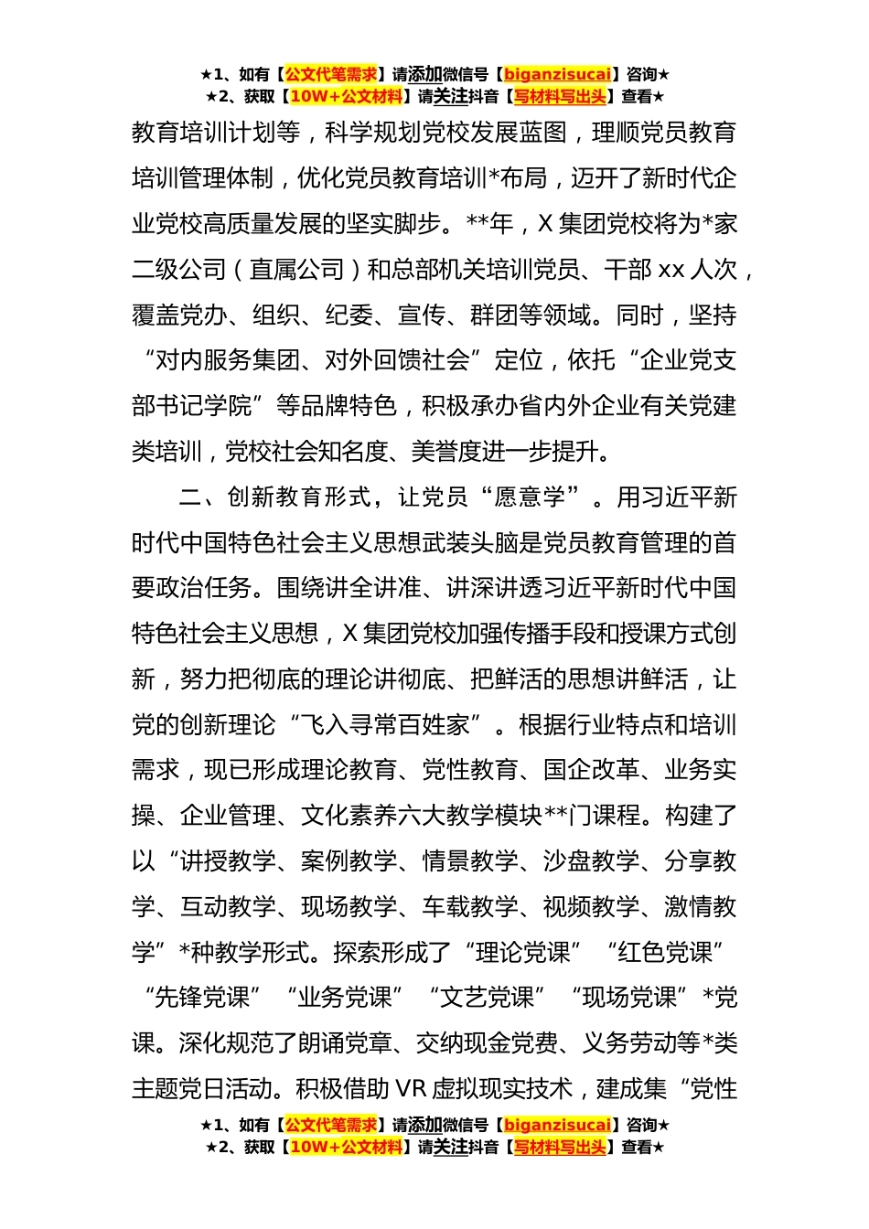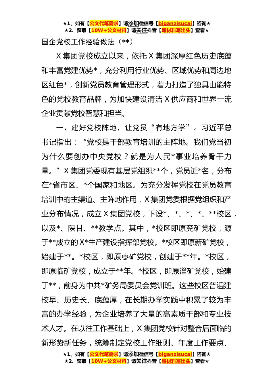 ★1、如有【公文代笔需求】请添加微信号【biganzisucai】咨询★★2、获取【10W+公文材料】请关注抖音【写材料写出头】查看★国企党校工作经验做法(**)X集团党校成立以来,依托X集团深厚红色历史底蕴和丰富党建优势*,充分利用行业优势、区域优势和周边地区红色*,创新党员教育管理形式,着力打造了独具山能特色的党校教育品牌,为加快建设清洁X供应商和世界一流企业贡献党校智慧和担当。一、建好党校阵地,让党员“有地方学”。习近平总书记指出:“党校是干部教育培训的主阵地。我们党当初为什么要创办中央党校?就是为人民*事业培养骨干力量。”X集团党委现有基层党组织**个,党员近*名,分布在*省市区、*个国家和地区。为充分发挥党校在党员教育培训中的主渠道、主阵地作用,X集团党委根据党组织和产业分布情...