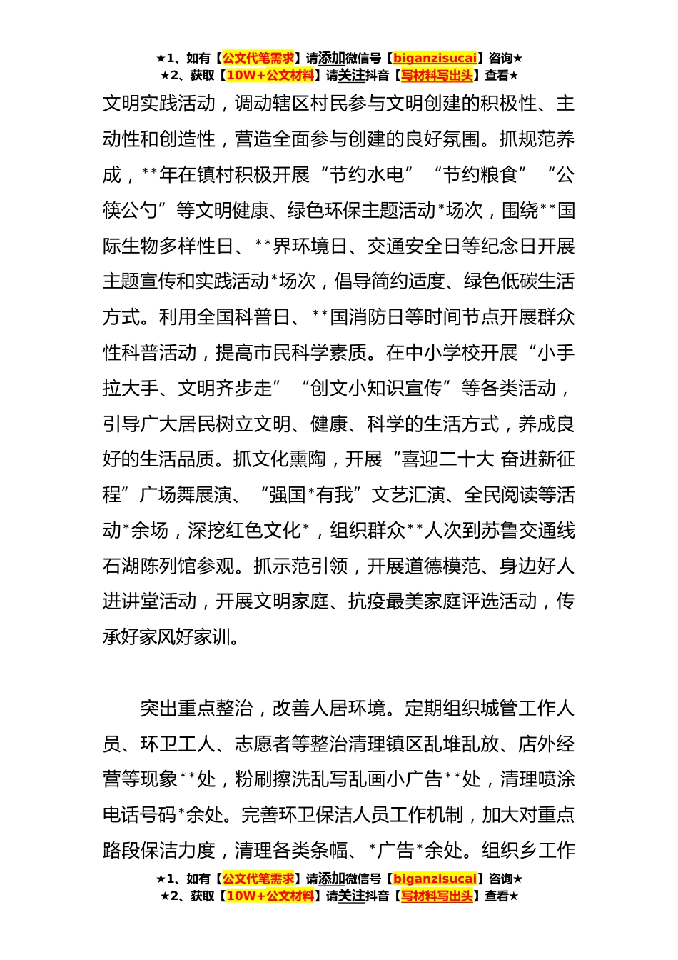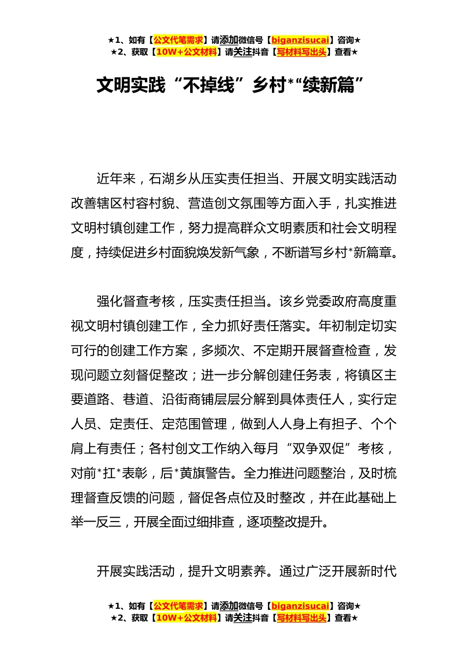 ★1、如有【公文代笔需求】请添加微信号【biganzisucai】咨询★★2、获取【10W+公文材料】请关注抖音【写材料写出头】查看★文明实践“不掉线”乡村*“续新篇”近年来,石湖乡从压实责任担当、开展文明实践活动改善辖区村容村貌、营造创文氛围等方面入手,扎实推进文明村镇创建工作,努力提高群众文明素质和社会文明程度,持续促进乡村面貌焕发新气象,不断谱写乡村*新篇章。强化督查考核,压实责任担当。该乡党委政府高度重视文明村镇创建工作,全力抓好责任落实。年初制定切实可行的创建工作方案,多频次、不定期开展督查检查,发现问题立刻督促整改;进一步分解创建任务表,将镇区主要道路、巷道、沿街商铺层层分解到具体责任人,实行定人员、定责任、定范围管理,做到人人身上有担子、个个肩上有责任;各村创...
