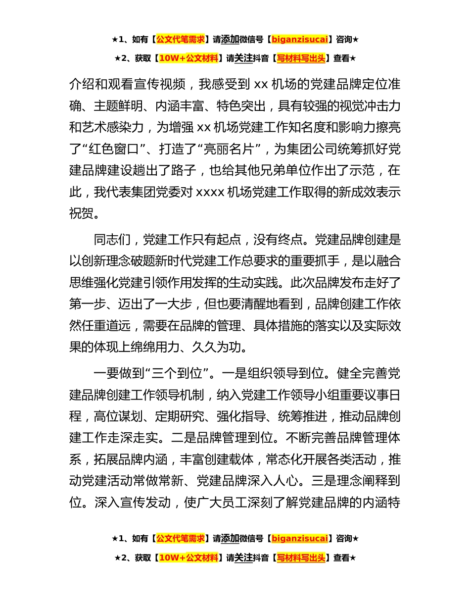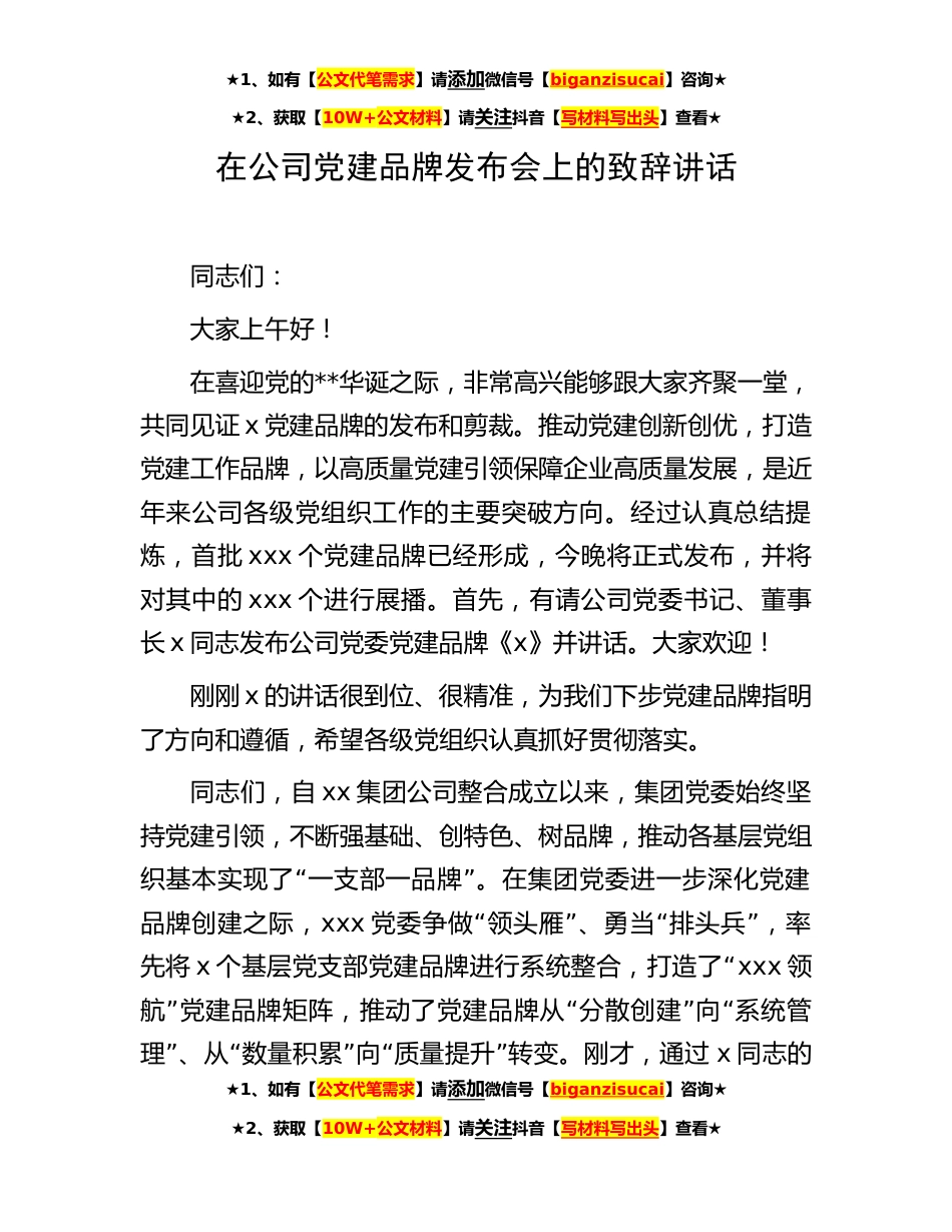 ★1、如有【公文代笔需求】请添加微信号【biganzisucai】咨询★★2、获取【10W+公文材料】请关注抖音【写材料写出头】查看★在公司党建品牌发布会上的致辞讲话同志们:大家上午好!在喜迎党的**华诞之际,非常高兴能够跟大家齐聚一堂,共同见证x党建品牌的发布和剪裁。推动党建创新创优,打造党建工作品牌,以高质量党建引领保障企业高质量发展,是近年来公司各级党组织工作的主要突破方向。经过认真总结提炼,首批xxx个党建品牌已经形成,今晚将正式发布,并将对其中的xxx个进行展播。首先,有请公司党委书记、董事长x同志发布公司党委党建品牌《x》并讲话。大家欢迎!刚刚x的讲话很到位、很精准,为我们下步党建品牌指明了方向和遵循,希望各级党组织认真抓好贯彻落实。同志们,自xx集团公司整合成立以来,集团...