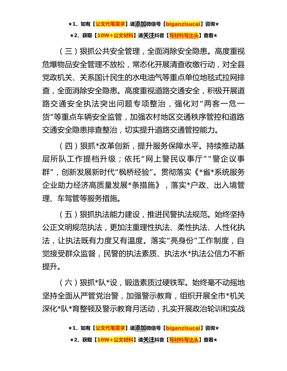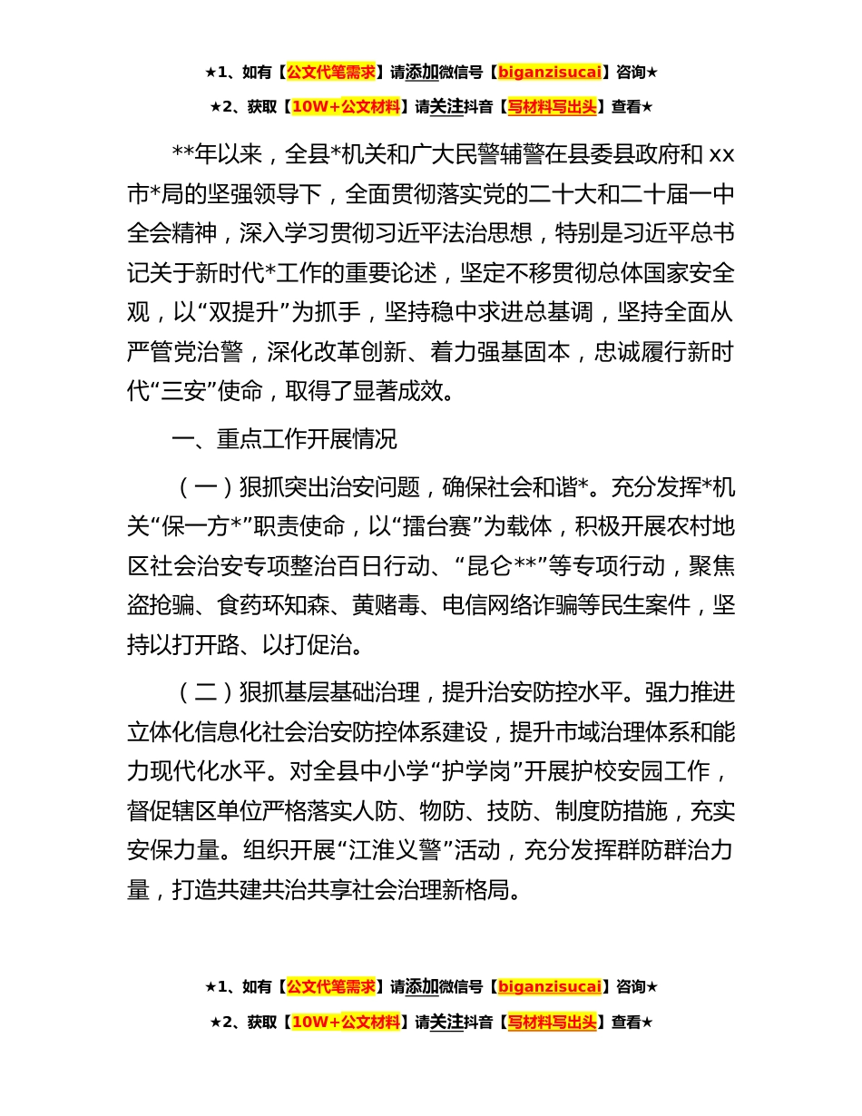 ★1、如有【公文代笔需求】请添加微信号【biganzisucai】咨询★★2、获取【10W+公文材料】请关注抖音【写材料写出头】查看★**年以来,全县*机关和广大民警辅警在县委县政府和xx市*局的坚强领导下,全面贯彻落实党的二十大和二十届一中全会精神,深入学习贯彻习近平法治思想,特别是习近平总书记关于新时代*工作的重要论述,坚定不移贯彻总体国家安全“”观,以双提升为抓手,坚持稳中求进总基调,坚持全面从严管党治警,深化改革创新、着力强基固本,忠诚履行新时“”代三安使命,取得了显著成效。一、重点工作开展情况(一)狠抓突出治安问题,确保社会和谐*。充分发挥*机“关保一方*”“”职责使命,以擂台赛为载体,积极开展农村地“区社会治安专项整治百日行动、昆仑**”等专项行动,聚焦盗抢骗、食药环知森...