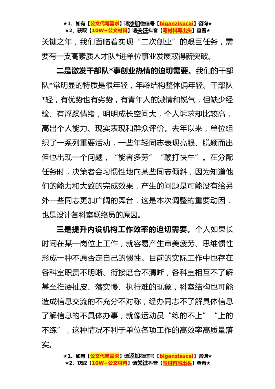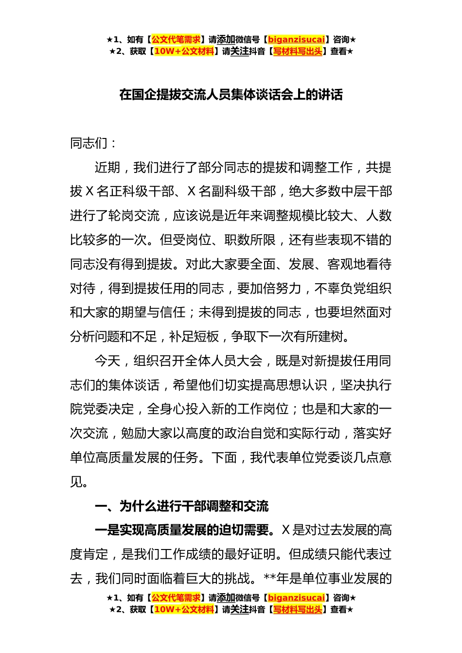 ★1、如有【公文代笔需求】请添加微信号【biganzisucai】咨询★★2、获取【10W+公文材料】请关注抖音【写材料写出头】查看★在国企提拔交流人员集体谈话会上的讲话同志们:近期,我们进行了部分同志的提拔和调整工作,共提拔X名正科级干部、X名副科级干部,绝大多数中层干部进行了轮岗交流,应该说是近年来调整规模比较大、人数比较多的一次。但受岗位、职数所限,还有些表现不错的同志没有得到提拔。对此大家要全面、发展、客观地看待对待,得到提拔任用的同志,要加倍努力,不辜负党组织和大家的期望与信任;未得到提拔的同志,也要坦然面对分析问题和不足,补足短板,争取下一次有所建树。今天,组织召开全体人员大会,既是对新提拔任用同志们的集体谈话,希望他们切实提高思想认识,坚决执行院党委决定,全身...
