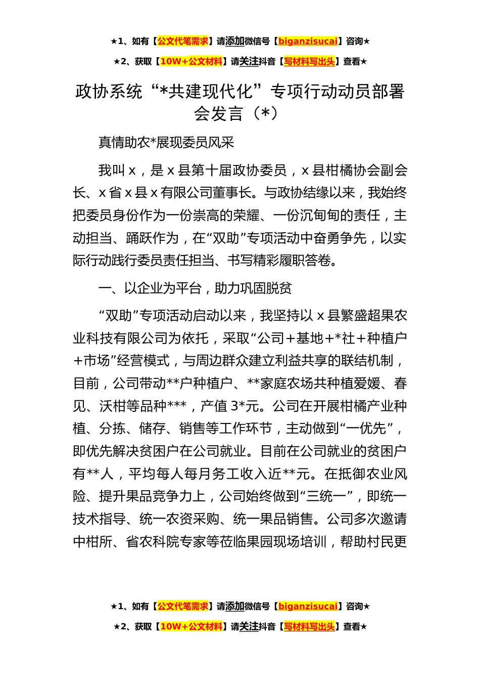 ★1、如有【公文代笔需求】请添加微信号【biganzisucai】咨询★★2、获取【10W+公文材料】请关注抖音【写材料写出头】查看★政协系统“*共建现代化”专项行动动员部署会发言(*)真情助农*展现委员风采我叫x,是x县第十届政协委员,x县柑橘协会副会长、x省x县x有限公司董事长。与政协结缘以来,我始终把委员身份作为一份崇高的荣耀、一份沉甸甸的责任,主“”动担当、踊跃作为,在双助专项活动中奋勇争先,以实际行动践行委员责任担当、书写精彩履职答卷。一、以企业为平台,助力巩固脱贫“”双助专项活动启动以来,我坚持以x县繁盛超果农“业科技有限公司为依托,采取公司+基地+*社+种植户+”市场经营模式,与周边群众建立利益共享的联结机制,目前,公司带动**户种植户、**家庭农场共种植爱媛、春见、沃柑等品种...