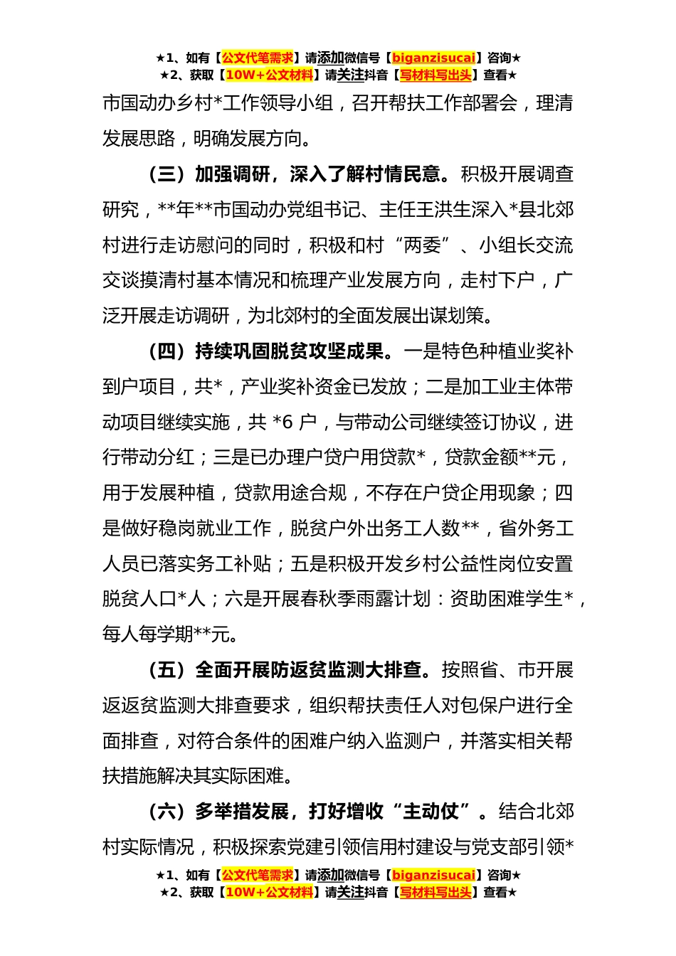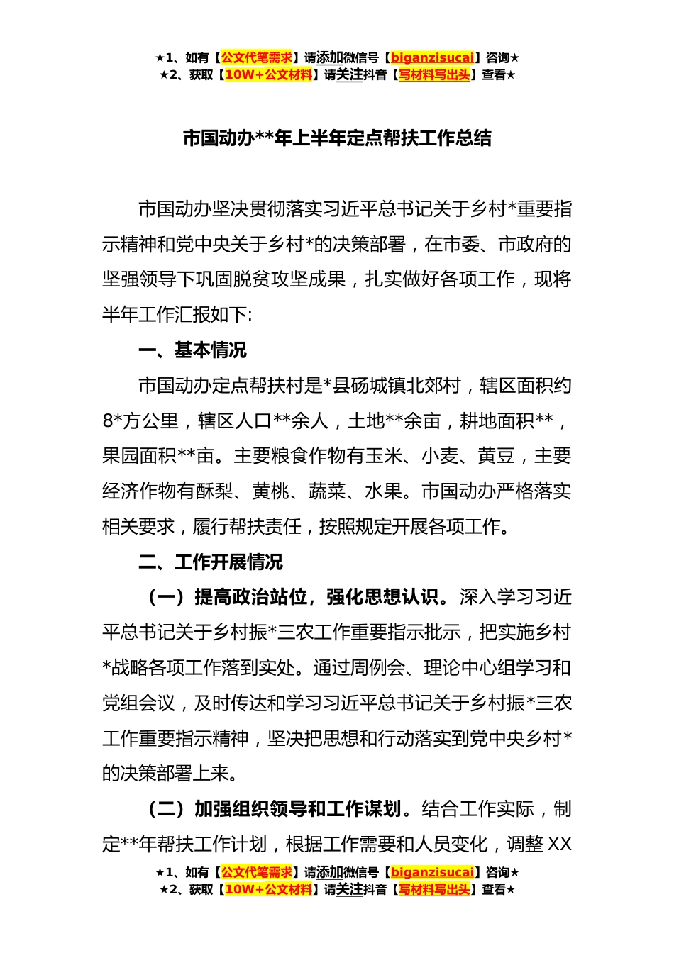 ★1、如有【公文代笔需求】请添加微信号【biganzisucai】咨询★★2、获取【10W+公文材料】请关注抖音【写材料写出头】查看★市国动办**年上半年定点帮扶工作总结市国动办坚决贯彻落实习近平总书记关于乡村*重要指示精神和党中央关于乡村*的决策部署,在市委、市政府的坚强领导下巩固脱贫攻坚成果,扎实做好各项工作,现将半年工作汇报如下:一、基本情况市国动办定点帮扶村是*县砀城镇北郊村,辖区面积约8*方公里,辖区人口**余人,土地**余亩,耕地面积**,果园面积**亩。主要粮食作物有玉米、小麦、黄豆,主要经济作物有酥梨、黄桃、蔬菜、水果。市国动办严格落实相关要求,履行帮扶责任,按照规定开展各项工作。二、工作开展情况(一)提高政治站位,强化思想认识。深入学习习近平总书记关于乡村振*三农工作重要...