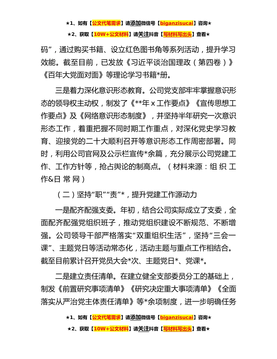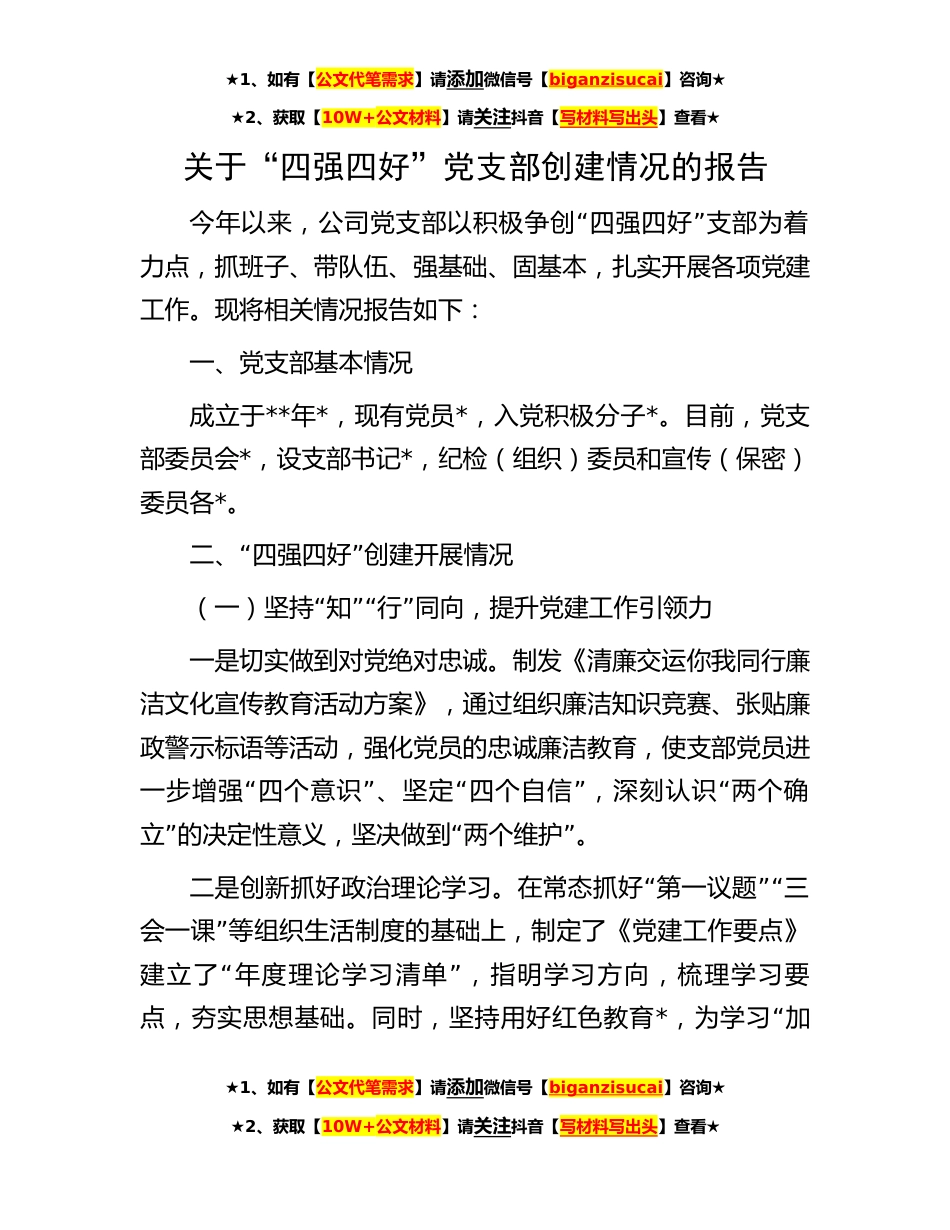 ★1、如有【公文代笔需求】请添加微信号【biganzisucai】咨询★★2、获取【10W+公文材料】请关注抖音【写材料写出头】查看★关于“四强四好”党支部创建情况的报告“”今年以来,公司党支部以积极争创四强四好支部为着力点,抓班子、带队伍、强基础、固基本,扎实开展各项党建工作。现将相关情况报告如下:一、党支部基本情况成立于**年*,现有党员*,入党积极分子*。目前,党支部委员会*,设支部书记*,纪检(组织)委员和宣传(保密)委员各*。“”二、四强四好创建开展情况“”“”(一)坚持知行同向,提升党建工作引领力一是切实做到对党绝对忠诚。制发《清廉交运你我同行廉洁文化宣传教育活动方案》,通过组织廉洁知识竞赛、张贴廉政警示标语等活动,强化党员的忠诚廉洁教育,使支部党员进“”“”“一步增...