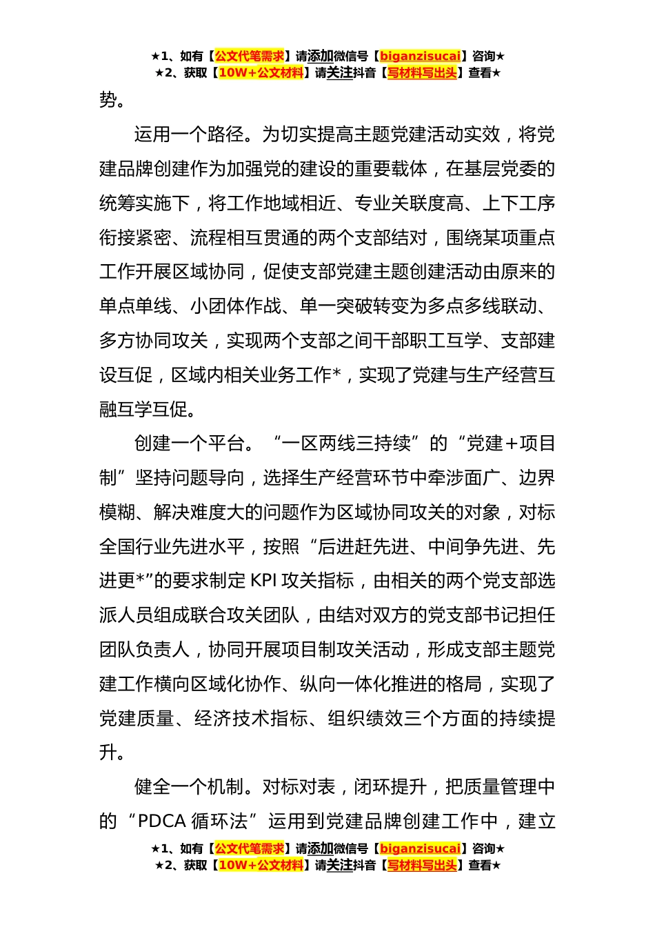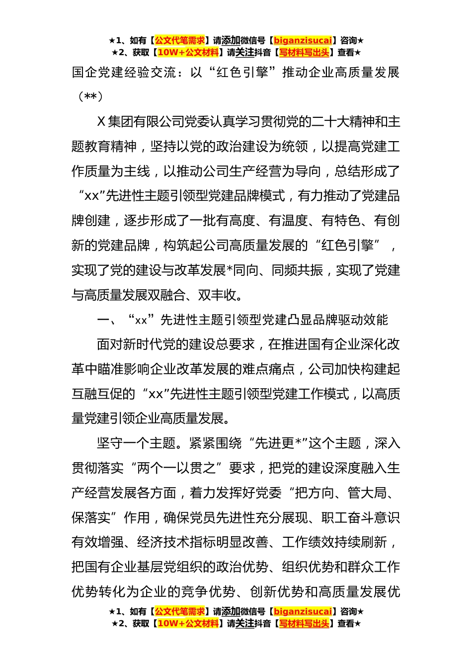 ★1、如有【公文代笔需求】请添加微信号【biganzisucai】咨询★★2、获取【10W+公文材料】请关注抖音【写材料写出头】查看★国企党建经验交流:以“红色引擎”推动企业高质量发展(**)X集团有限公司党委认真学习贯彻党的二十大精神和主题教育精神,坚持以党的政治建设为统领,以提高党建工作质量为主线,以推动公司生产经营为导向,总结形成了“xx”先进性主题引领型党建品牌模式,有力推动了党建品牌创建,逐步形成了一批有高度、有温度、有特色、有创新的党建品牌,构筑起公司高质量发展的“红色引擎”,实现了党的建设与改革发展*同向、同频共振,实现了党建与高质量发展双融合、双丰收。一、“xx”先进性主题引领型党建凸显品牌驱动效能面对新时代党的建设总要求,在推进国有企业深化改革中瞄准影响企业改革...