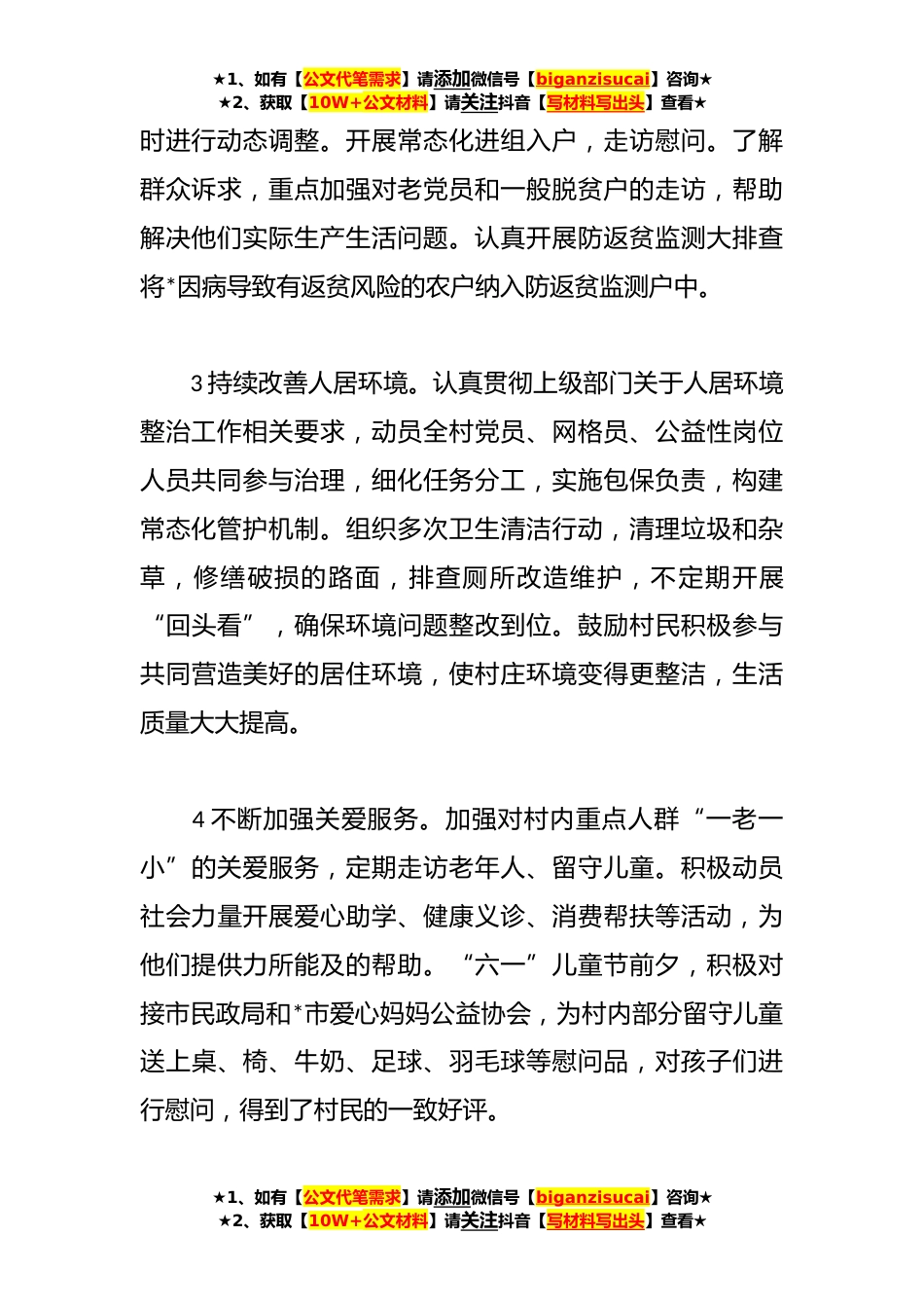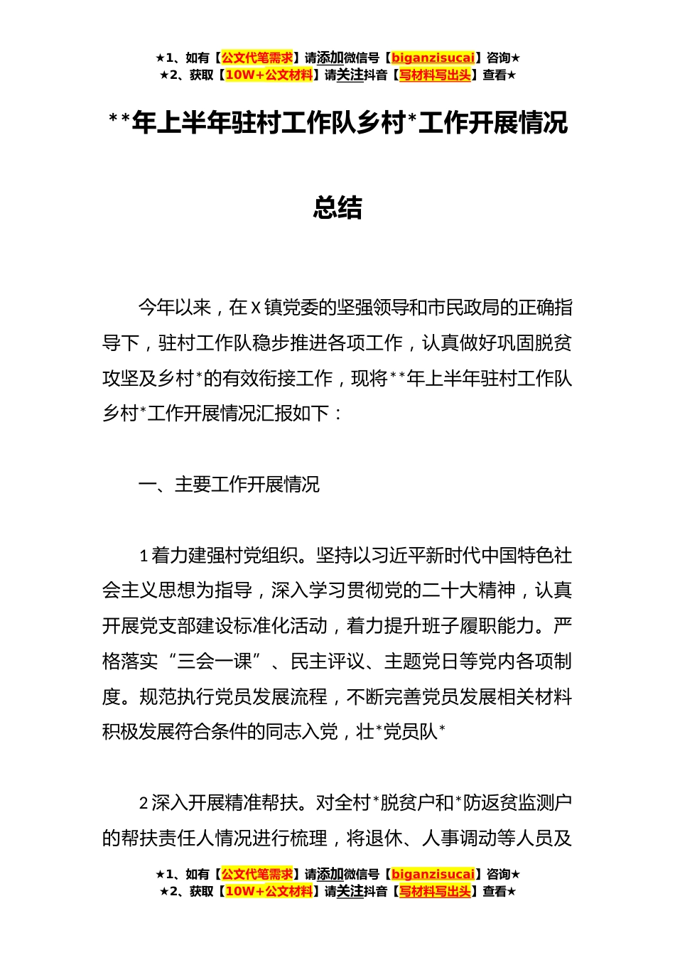 ★1、如有【公文代笔需求】请添加微信号【biganzisucai】咨询★★2、获取【10W+公文材料】请关注抖音【写材料写出头】查看★**年上半年驻村工作队乡村*工作开展情况总结今年以来,在X镇党委的坚强领导和市民政局的正确指导下,驻村工作队稳步推进各项工作,认真做好巩固脱贫攻坚及乡村*的有效衔接工作,现将**年上半年驻村工作队乡村*工作开展情况汇报如下:一、主要工作开展情况1着力建强村党组织。坚持以习近平新时代中国特色社会主义思想为指导,深入学习贯彻党的二十大精神,认真开展党支部建设标准化活动,着力提升班子履职能力。严格落实“三会一课”、民主评议、主题党日等党内各项制度。规范执行党员发展流程,不断完善党员发展相关材料积极发展符合条件的同志入党,壮*党员队*2深入开展精准帮扶。对全村*...