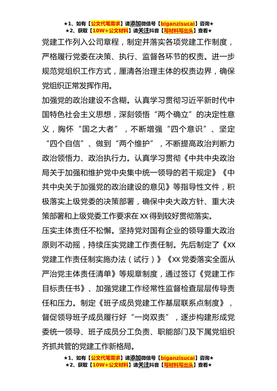 ★1、如有【公文代笔需求】请添加微信号【biganzisucai】咨询★★2、获取【10W+公文材料】请关注抖音【写材料写出头】查看★XX国企党建经验交流:党建引领促进企业绿色高质量发展近年来,XX紧紧围绕XX集团做践行“双碳”战略领跑者、生态产品价值实现示范者、构建现代林业产业体系领军者国家木材安全压舱石,致力成为国内最大碳汇经营实体和生态产品价值实现重要运营平台的战略部署,坚持党建引领,着力构建“科研积累+一二三产联动发展”经营总体布局,在聚焦发展中奋力拼搏、在抢抓机遇中乘势而上、在转型升级中砥砺前行,全力应对化解各种挑战和不利因素,在党的建设、改革发展、经营管理、科技创新及企业文化建设等方面取得了较好成效。一、坚持把方向定基调,推动政治思想建设全面过硬公司党委坚持以习近平...