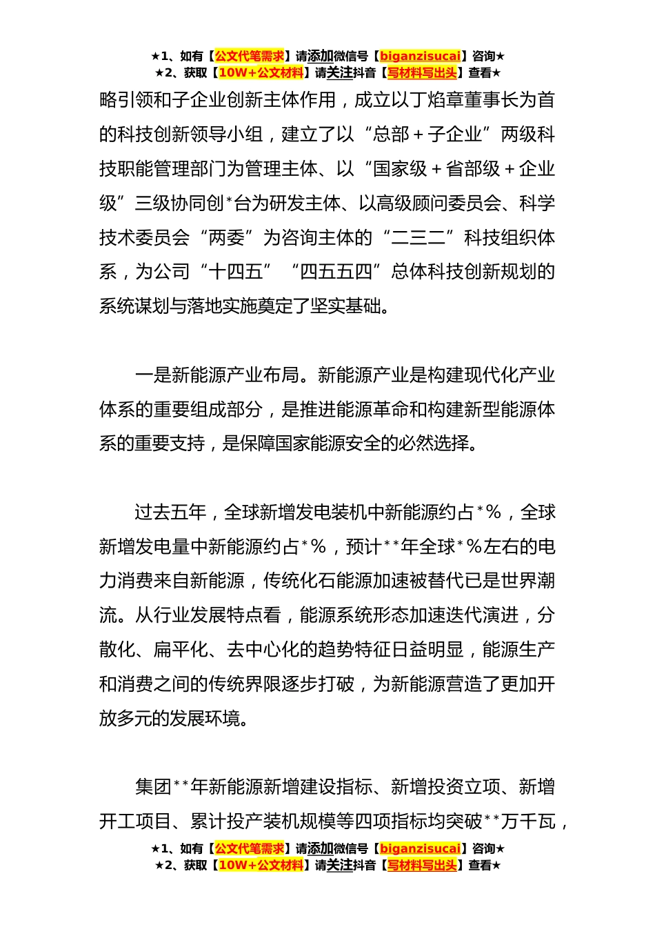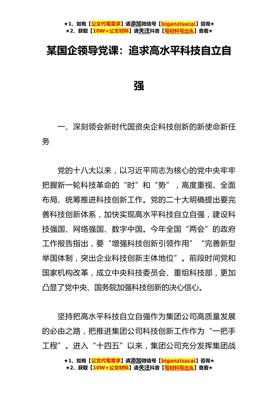 ★1、如有【公文代笔需求】请添加微信号【biganzisucai】咨询★★2、获取【10W+公文材料】请关注抖音【写材料写出头】查看★某国企领导党课:追求高水平科技自立自强一、深刻领会新时代国资央企科技创新的新使命新任务党的十八大以来,以习近平同志为核心的党中央牢牢把握新一轮科技革命的“时”和“势”,高度重视、全面布局、统筹推进科技创新工作。党的二十大明确提出要完善科技创新体系,加快实现高水平科技自立自强,建设科技强国、网络强国、数字中国。今年全国“两会”的政府工作报告指出,要“增强科技创新引领作用”“完善新型举国体制,突出企业科技创新主体地位”。前段时间党和国家机构改革,成立中央科技委员会、重组科技部,更加凸显了党中央、国务院加强科技创新的决心信心。坚持把高水平科技自立...