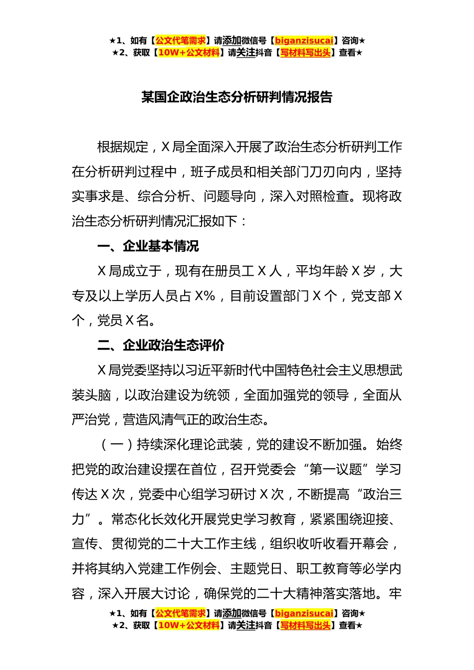 ★1、如有【公文代笔需求】请添加微信号【biganzisucai】咨询★★2、获取【10W+公文材料】请关注抖音【写材料写出头】查看★某国企政治生态分析研判情况报告根据规定,X局全面深入开展了政治生态分析研判工作在分析研判过程中,班子成员和相关部门刀刃向内,坚持实事求是、综合分析、问题导向,深入对照检查。现将政治生态分析研判情况汇报如下:一、企业基本情况X局成立于,现有在册员工X人,平均年龄X岁,大专及以上学历人员占X%,目前设置部门X个,党支部X个,党员X名。二、企业政治生态评价X局党委坚持以习近平新时代中国特色社会主义思想武装头脑,以政治建设为统领,全面加强党的领导,全面从严治党,营造风清气正的政治生态。(一)持续深化理论武装,党的建设不断加强。始终把党的政治建设摆在首位,召开...