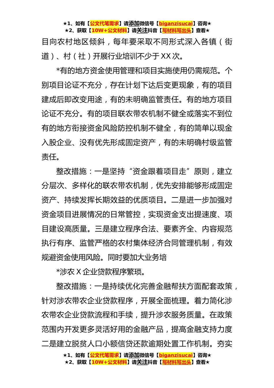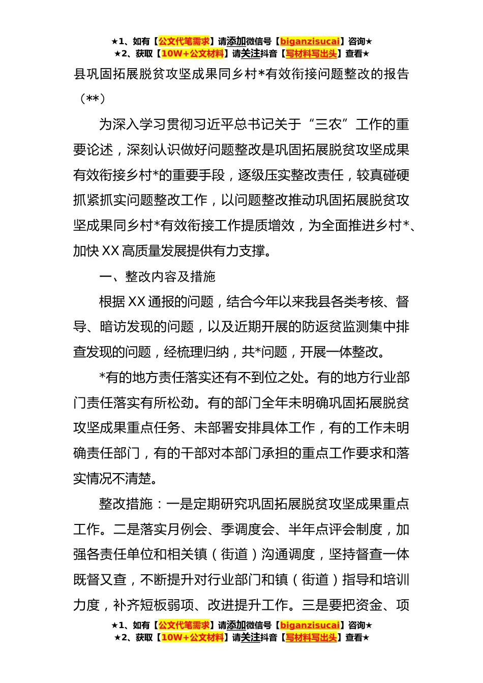 ★1、如有【公文代笔需求】请添加微信号【biganzisucai】咨询★★2、获取【10W+公文材料】请关注抖音【写材料写出头】查看★县巩固拓展脱贫攻坚成果同乡村*有效衔接问题整改的报告(**)为深入学习贯彻习近平总书记关于“三农”工作的重要论述,深刻认识做好问题整改是巩固拓展脱贫攻坚成果有效衔接乡村*的重要手段,逐级压实整改责任,较真碰硬抓紧抓实问题整改工作,以问题整改推动巩固拓展脱贫攻坚成果同乡村*有效衔接工作提质增效,为全面推进乡村*、加快XX高质量发展提供有力支撑。一、整改内容及措施根据XX通报的问题,结合今年以来我县各类考核、督导、暗访发现的问题,以及近期开展的防返贫监测集中排查发现的问题,经梳理归纳,共*问题,开展一体整改。*有的地方责任落实还有不到位之处。有的地方行业部...