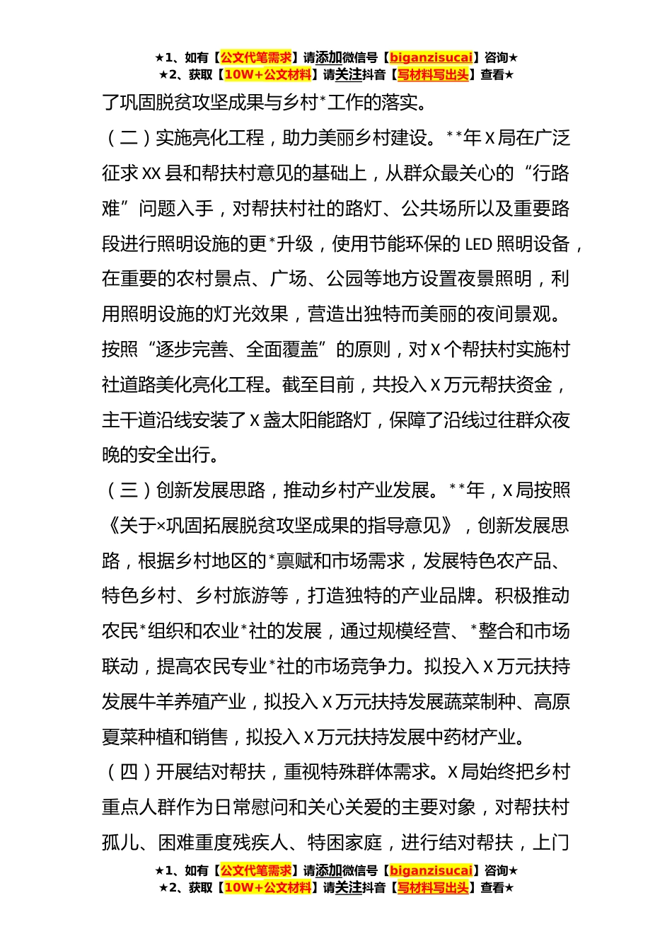 ★1、如有【公文代笔需求】请添加微信号【biganzisucai】咨询★★2、获取【10W+公文材料】请关注抖音【写材料写出头】查看★某局在**年上半年巩固脱贫攻坚帮扶工作成果同乡村*有效衔接工作总结**年以来,X局驻XX县XX镇XX村定点帮扶工作,坚决落实巩固脱贫攻坚成果与乡村*有效衔接工作要求,较好地完成了各项帮扶任务,按照《XX的通知》(XX〔**〕XX号)要求,现将X局**年上半年巩固脱贫攻坚成果与乡村*有效衔接帮扶工作总结如下:一、帮扶工作成效(一)提高政治站位,履行帮扶主体责任。X局党委高度重视乡村*工作,始终把服务乡村*作为一项重要工作来抓,并将其纳入局年度工作要点,制定年度帮扶计划,坚持把帮扶工作纳入X局服务乡村*的“大盘子”统筹谋划。局党委主要负责同志履行“第一责任人”责任,对帮扶资...