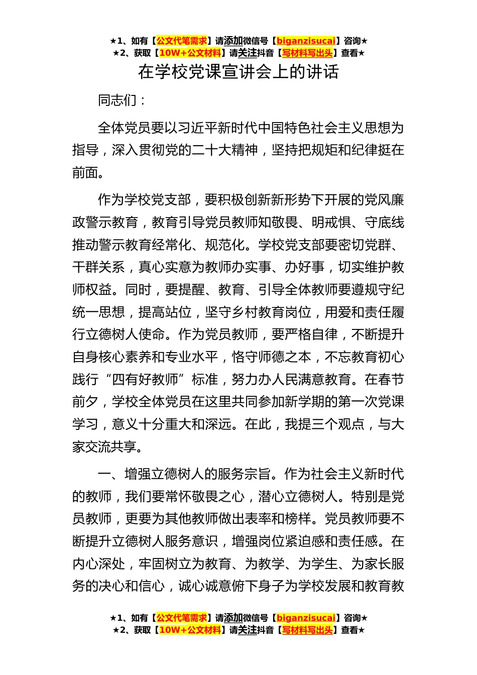 ★1、如有【公文代笔需求】请添加微信号【biganzisucai】咨询★★2、获取【10W+公文材料】请关注抖音【写材料写出头】查看★★1、如有【公文代笔需求】请添加微信号【biganzisucai】咨询★★2、获取【10W+公文材料】请关注抖音【写材料写出头】查看★★1、如有【公文代笔需求】请添加微信号【biganzisucai】咨询★★2、获取【10W+公文材料】请关注抖音【写材料写出头】查看★在学校党课宣讲会上的讲话同志们:全体党员要以习近平新时代中国特色社会主义思想为指导,深入贯彻党的二十大精神,坚持把规矩和纪律挺在前面。作为学校党支部,要积极创新新形势下开展的党风廉政警示教育,教育引导党员教师知敬畏、明戒惧、守底线推动警示教育经常化、规范化。学校党支部要密切党群、干群关系,真心实意为教师办实事、办...