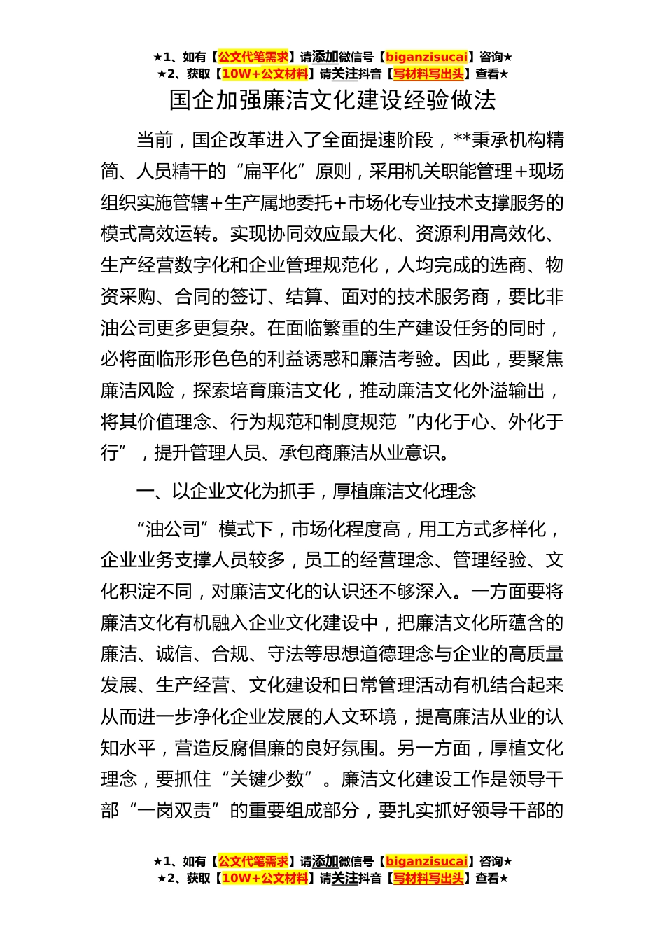 ★1、如有【公文代笔需求】请添加微信号【biganzisucai】咨询★★2、获取【10W+公文材料】请关注抖音【写材料写出头】查看★★1、如有【公文代笔需求】请添加微信号【biganzisucai】咨询★★2、获取【10W+公文材料】请关注抖音【写材料写出头】查看★★1、如有【公文代笔需求】请添加微信号【biganzisucai】咨询★★2、获取【10W+公文材料】请关注抖音【写材料写出头】查看★国企加强廉洁文化建设经验做法当前,国企改革进入了全面提速阶段,**秉承机构精简、人员精干的“扁平化”原则,采用机关职能管理+现场组织实施管辖+生产属地委托+市场化专业技术支撑服务的模式高效运转。实现协同效应最大化、资源利用高效化、生产经营数字化和企业管理规范化,人均完成的选商、物资采购、合同的签订、结算、面对的技术服务...