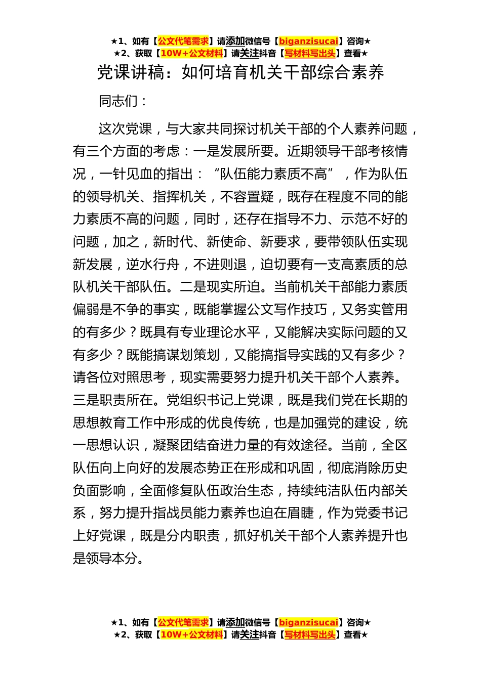 ★1、如有【公文代笔需求】请添加微信号【biganzisucai】咨询★★2、获取【10W+公文材料】请关注抖音【写材料写出头】查看★★1、如有【公文代笔需求】请添加微信号【biganzisucai】咨询★★2、获取【10W+公文材料】请关注抖音【写材料写出头】查看★★1、如有【公文代笔需求】请添加微信号【biganzisucai】咨询★★2、获取【10W+公文材料】请关注抖音【写材料写出头】查看★党课讲稿:如何培育机关干部综合素养同志们:这次党课,与大家共同探讨机关干部的个人素养问题,有三个方面的考虑:一是发展所要。近期领导干部考核情况,一针见血的指出:“队伍能力素质不高”,作为队伍的领导机关、指挥机关,不容置疑,既存在程度不同的能力素质不高的问题,同时,还存在指导不力、示范不好的问题,加之,新时代、新使...