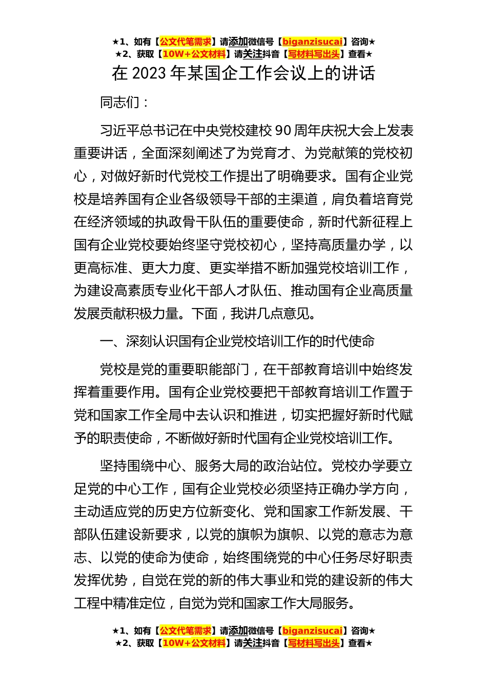 ★1、如有【公文代笔需求】请添加微信号【biganzisucai】咨询★★2、获取【10W+公文材料】请关注抖音【写材料写出头】查看★★1、如有【公文代笔需求】请添加微信号【biganzisucai】咨询★★2、获取【10W+公文材料】请关注抖音【写材料写出头】查看★★1、如有【公文代笔需求】请添加微信号【biganzisucai】咨询★★2、获取【10W+公文材料】请关注抖音【写材料写出头】查看★在2023年某国企工作会议上的讲话同志们:习近平总书记在中央党校建校90周年庆祝大会上发表重要讲话,全面深刻阐述了为党育才、为党献策的党校初心,对做好新时代党校工作提出了明确要求。国有企业党校是培养国有企业各级领导干部的主渠道,肩负着培育党在经济领域的执政骨干队伍的重要使命,新时代新征程上国有企业党校要始终坚守党校初心...