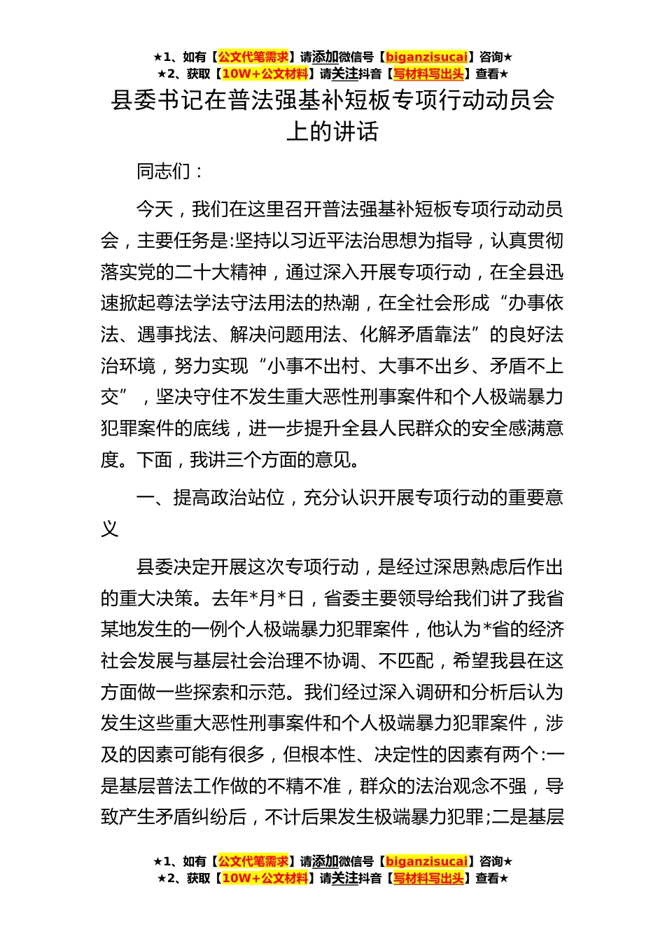 ★1、如有【公文代笔需求】请添加微信号【biganzisucai】咨询★★2、获取【10W+公文材料】请关注抖音【写材料写出头】查看★★1、如有【公文代笔需求】请添加微信号【biganzisucai】咨询★★2、获取【10W+公文材料】请关注抖音【写材料写出头】查看★★1、如有【公文代笔需求】请添加微信号【biganzisucai】咨询★★2、获取【10W+公文材料】请关注抖音【写材料写出头】查看★县委书记在普法强基补短板专项行动动员会上的讲话同志们:今天,我们在这里召开普法强基补短板专项行动动员会,主要任务是:坚持以习近平法治思想为指导,认真贯彻落实党的二十大精神,通过深入开展专项行动,在全县迅速掀起尊法学法守法用法的热潮,在全社会形成“办事依法、遇事找法、解决问题用法、化解矛盾靠法”的良好法治环境,努力实...