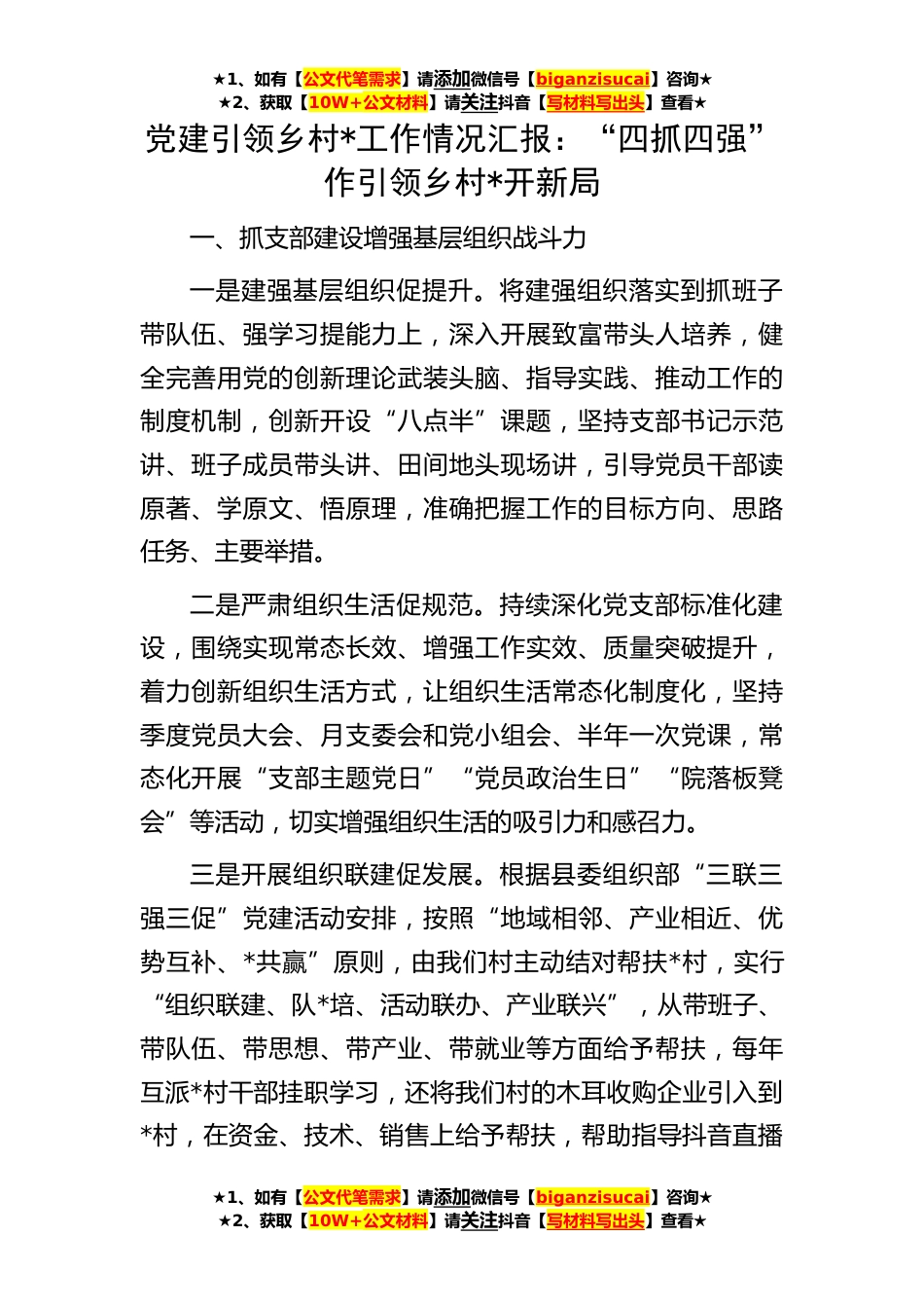 ★1、如有【公文代笔需求】请添加微信号【biganzisucai】咨询★★2、获取【10W+公文材料】请关注抖音【写材料写出头】查看★★1、如有【公文代笔需求】请添加微信号【biganzisucai】咨询★★2、获取【10W+公文材料】请关注抖音【写材料写出头】查看★★1、如有【公文代笔需求】请添加微信号【biganzisucai】咨询★★2、获取【10W+公文材料】请关注抖音【写材料写出头】查看★党建引领乡村*工作情况汇报:“四抓四强”作引领乡村*开新局一、抓支部建设增强基层组织战斗力一是建强基层组织促提升。将建强组织落实到抓班子带队伍、强学习提能力上,深入开展致富带头人培养,健全完善用党的创新理论武装头脑、指导实践、推动工作的制度机制,创新开设“八点半”课题,坚持支部书记示范讲、班子成员带头讲、田间地头现...
