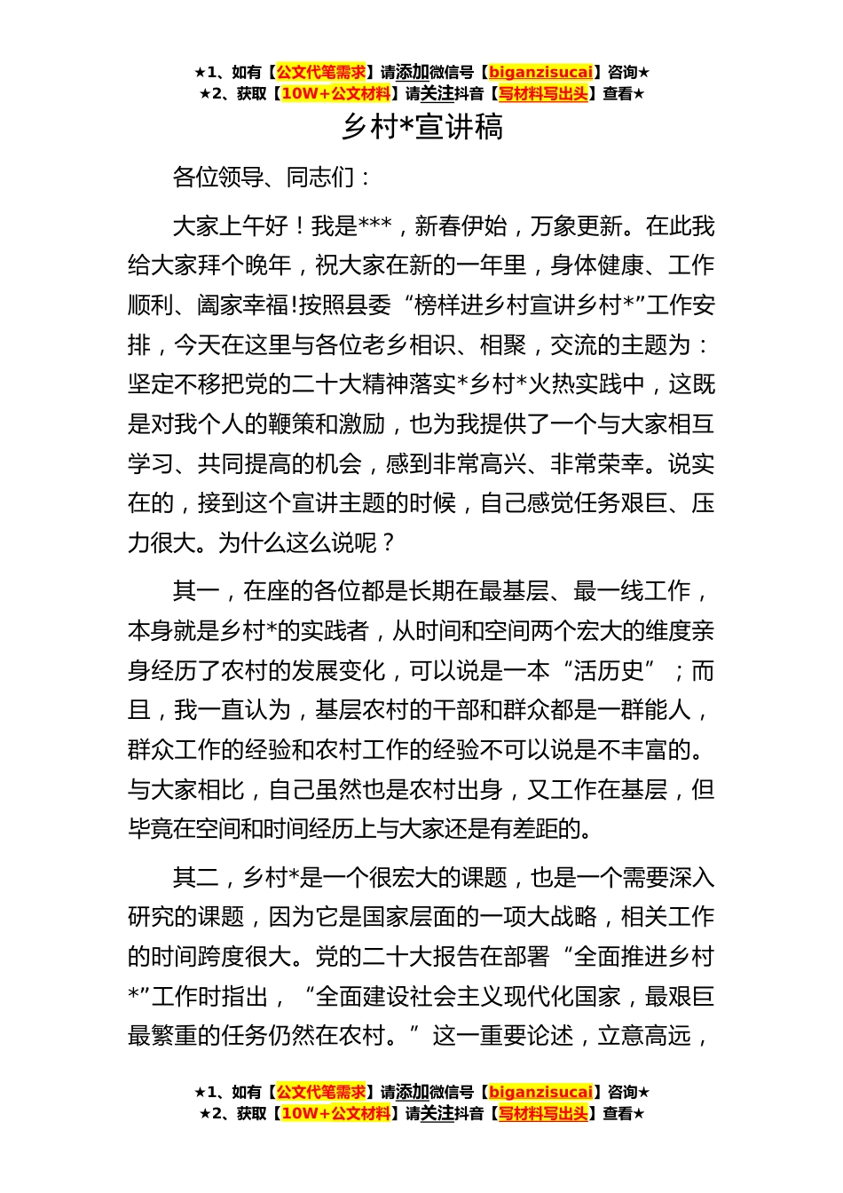 ★1、如有【公文代笔需求】请添加微信号【biganzisucai】咨询★★2、获取【10W+公文材料】请关注抖音【写材料写出头】查看★★1、如有【公文代笔需求】请添加微信号【biganzisucai】咨询★★2、获取【10W+公文材料】请关注抖音【写材料写出头】查看★★1、如有【公文代笔需求】请添加微信号【biganzisucai】咨询★★2、获取【10W+公文材料】请关注抖音【写材料写出头】查看★乡村*宣讲稿各位领导、同志们:大家上午好!我是***,新春伊始,万象更新。在此我给大家拜个晚年,祝大家在新的一年里,身体健康、工作顺利、阖家幸福!按照县委“榜样进乡村宣讲乡村*”工作安排,今天在这里与各位老乡相识、相聚,交流的主题为:坚定不移把党的二十大精神落实*乡村*火热实践中,这既是对我个人的鞭策和激励,也为我提供了...