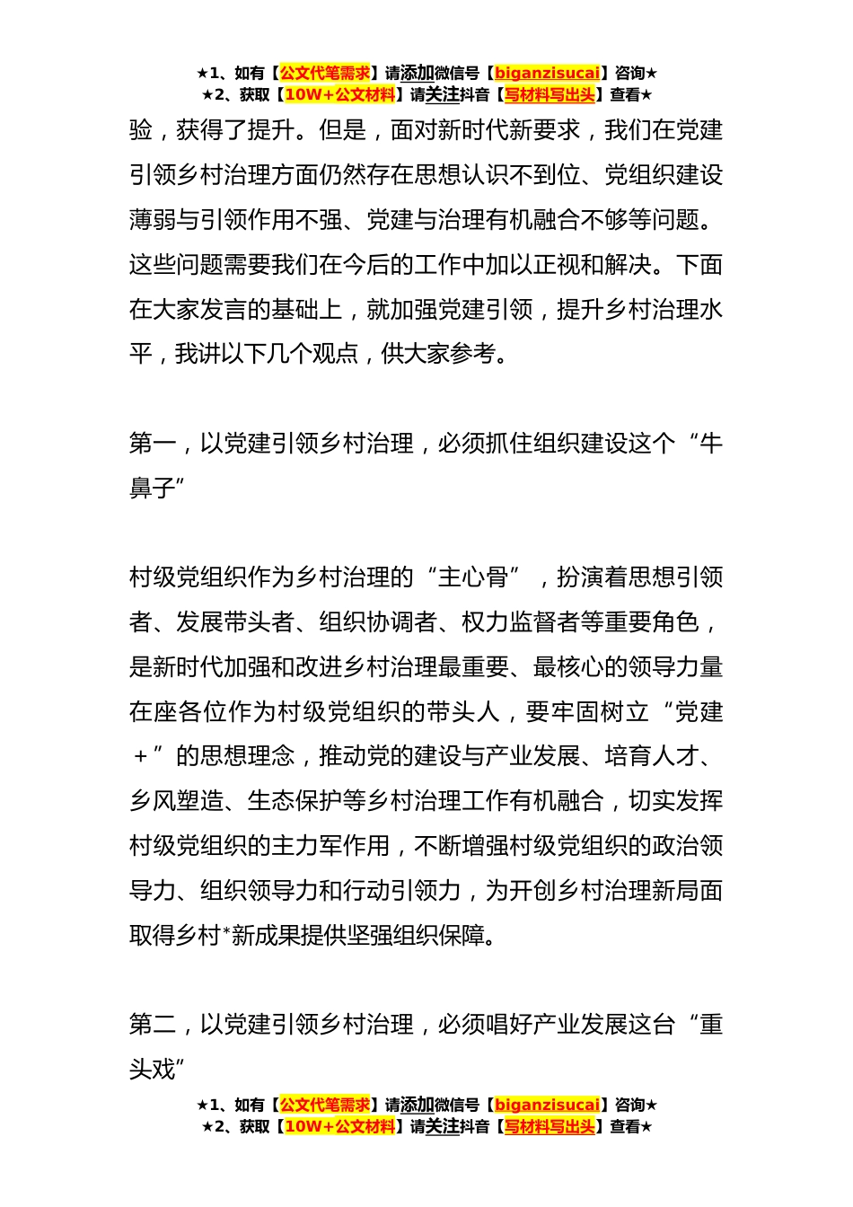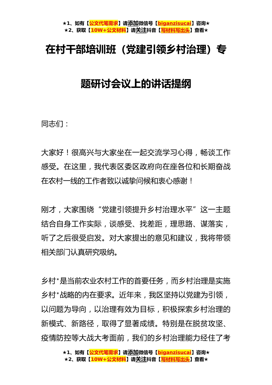 ★1、如有【公文代笔需求】请添加微信号【biganzisucai】咨询★★2、获取【10W+公文材料】请关注抖音【写材料写出头】查看★在村干部培训班(党建引领乡村治理)专题研讨会议上的讲话提纲同志们:大家好!很高兴与大家坐在一起交流学习心得,畅谈工作感受。在这里,我代表区委区政府向在座各位和长期奋战在农村一线的工作者致以诚挚问候和衷心感谢!刚才,大家围绕“党建引领提升乡村治理水平”这一主题结合自身工作实际,谈感受、找差距,理思路、谋落实,听了之后很受启发。对大家提出的意见和建议,我将带领相关部门认真研究吸纳。乡村*是当前农业农村工作的首要任务,而乡村治理是实施乡村*战略的内在要求。近年来,我区坚持以党建为引领,以问题为导向,以治理有效为目标,积极探索乡村治理的新模式、新路径...